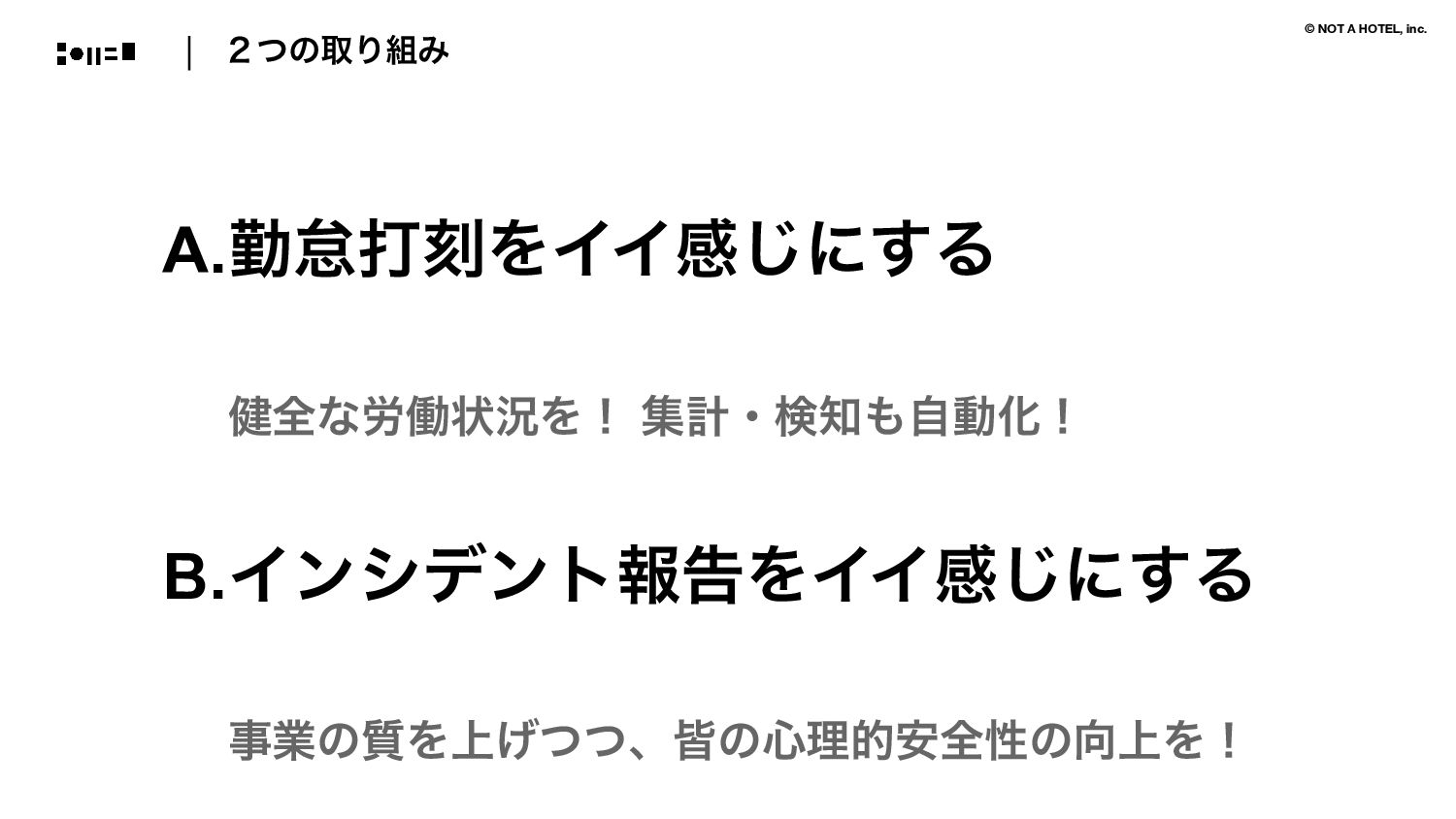 © NOT A HOTEL, inc. A.ۈଵଧࠁΛΠΠײ͡ʹ͢Δ ݈શͳ࿑ಇঢ়گΛʂ ूܭɾݕࣗಈԽʂ B.ΠϯγσϯτใࠂΛΠΠײ͡ʹ͢Δ