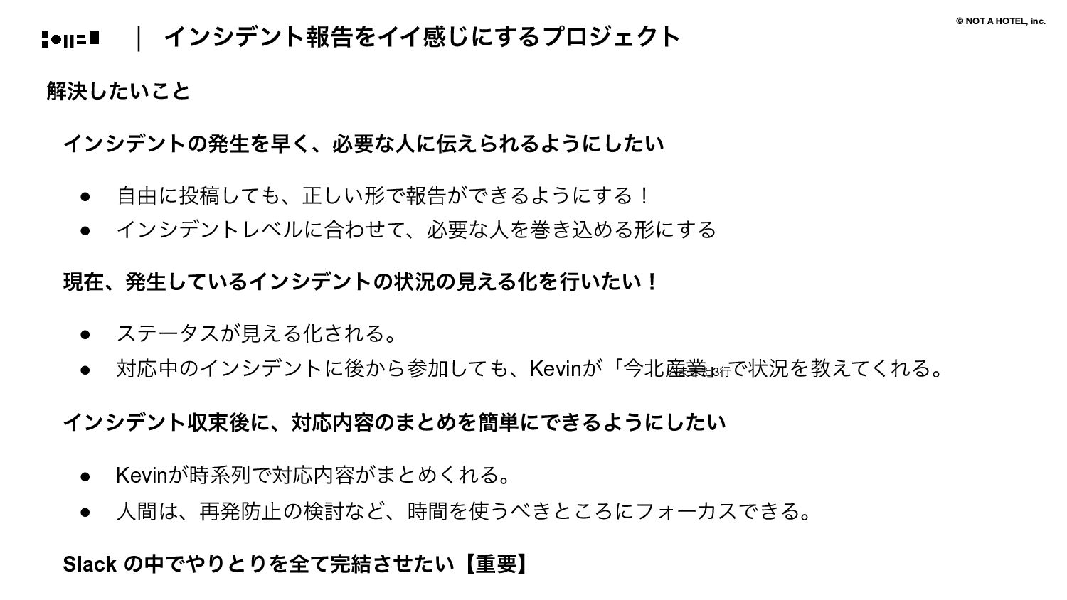 ΠϯγσϯτϨϕϧʹ߹ΘͤͯɺඞཁͳਓΛר͖ࠐΊΔܗʹ͢Δ ݱࡏɺൃੜ͍ͯ͠ΔΠϯγσϯτͷঢ়گͷݟ͑ΔԽΛߦ͍͍ͨʂ • εςʔλε͕ݟ͑ΔԽ͞ΕΔɻ • ରԠதͷΠϯγσϯτʹޙ͔ΒࢀՃͯ͠ɺKevin͕ʮࠓ࢈ۀʯͰঢ়گΛڭ͑ͯ͘ΕΔɻ ΠϯγσϯτऩଋޙʹɺରԠ༰ͷ·ͱΊΛ؆୯ʹͰ͖ΔΑ͏ʹ͍ͨ͠ • Kevin͕࣌ܥྻͰରԠ༰͕·ͱΊ͘ΕΔɻ • ਓؒɺ࠶ൃࢭͷݕ౼ͳͲɺ࣌ؒΛ͏͖ͱ͜ΖʹϑΥʔΧεͰ͖Δɻ Slack ͷதͰΓͱΓΛશ͍ͯ݁ͤͨ͞ʲॏཁʳ ղܾ͍ͨ͜͠ͱ ͍·͖ͨ3ߦ