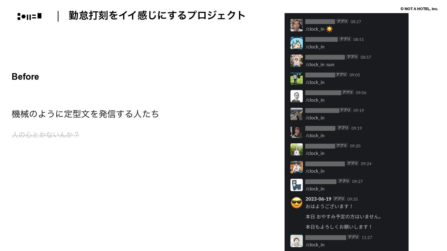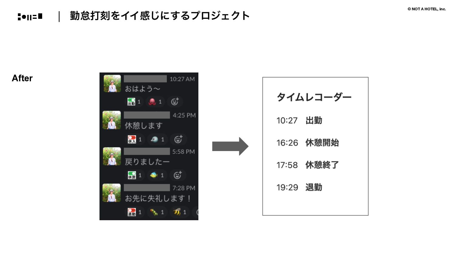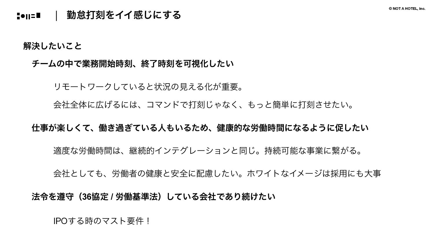 © NOT A HOTEL, inc. νʔϜͷதͰۀ։࢝࣌ࠁɺऴྃ࣌ࠁΛՄࢹԽ͍ͨ͠ ϦϞʔτϫʔΫ͍ͯ͠Δͱঢ়گͷݟ͑ΔԽ͕ॏཁɻ ձࣾશମʹ͛ΔʹɺίϚϯυͰଧࠁ͡Όͳ͘ɺͬͱ؆୯ʹଧࠁ͍ͤͨ͞ɻ ࣄָ͕ͯ͘͠ɺಇ͖ա͍͗ͯΔਓ͍ΔͨΊɺ݈߁తͳ࿑ಇ࣌ؒʹͳΔΑ͏ʹଅ͍ͨ͠