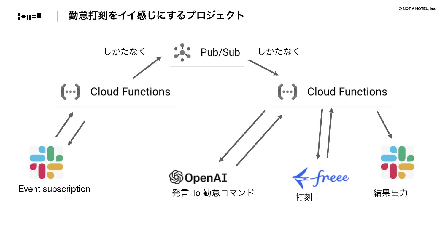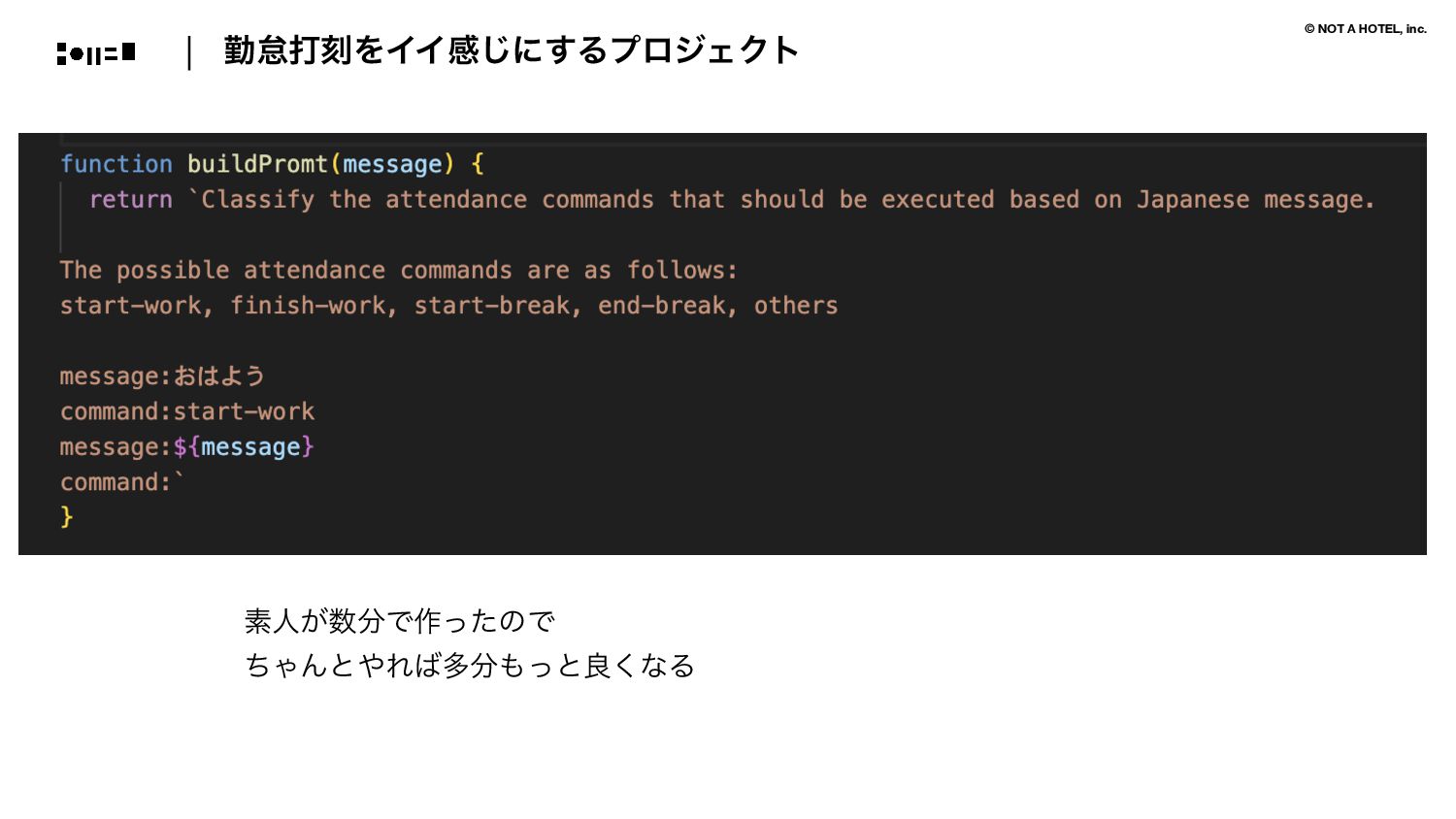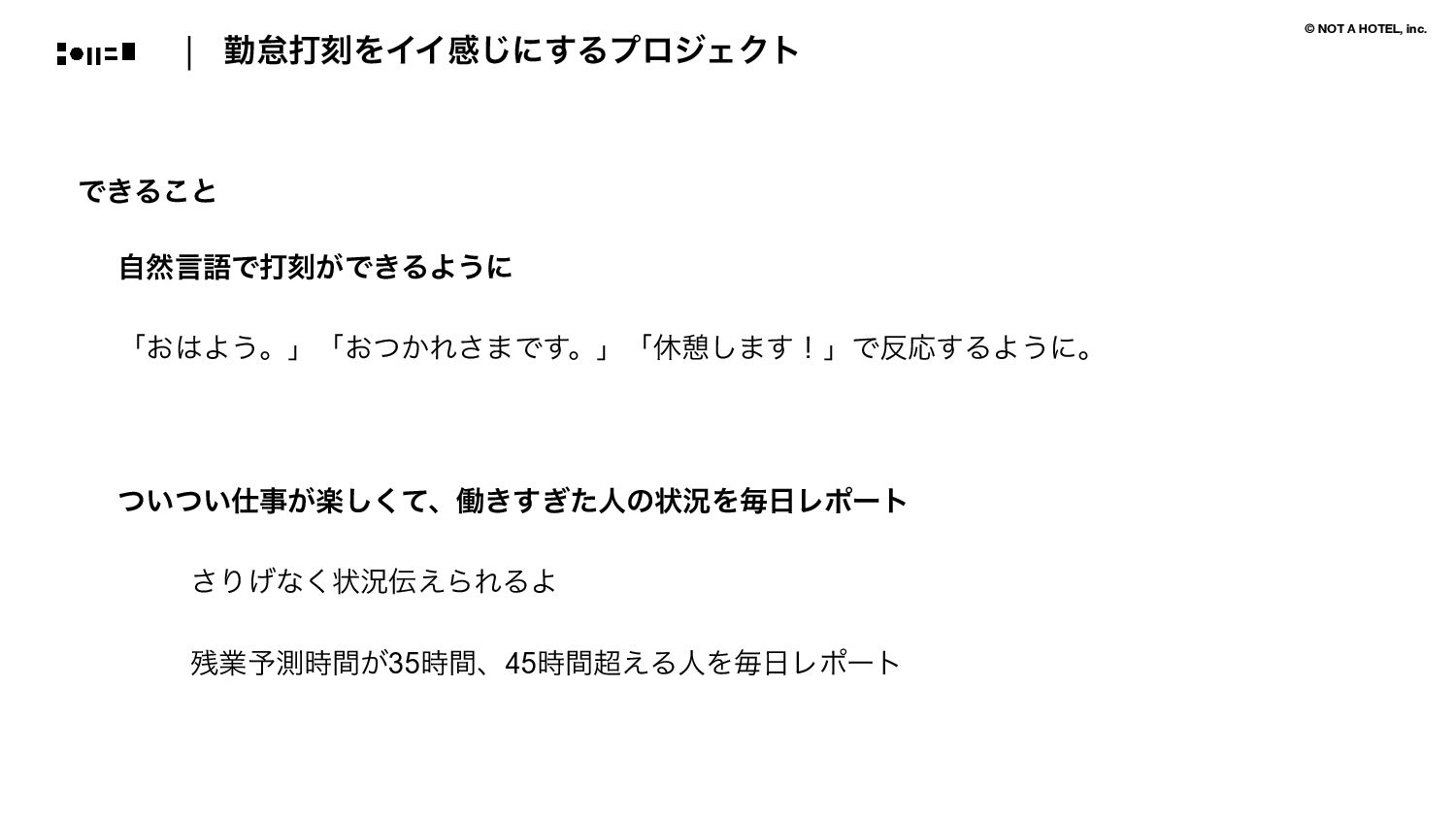 2023/7/6 NOT A HOTELのhackathonで社内発表用として使用したスライドです。