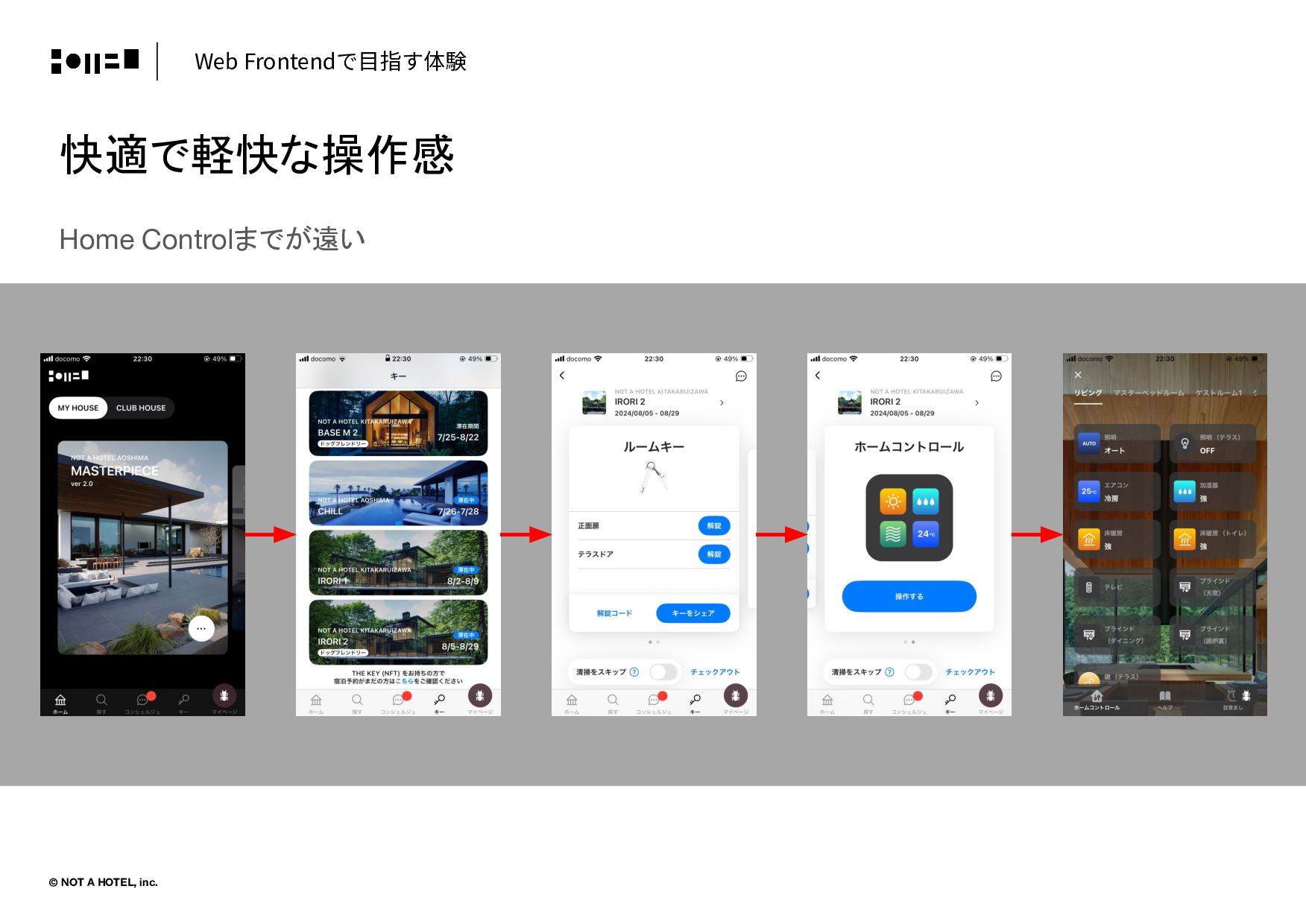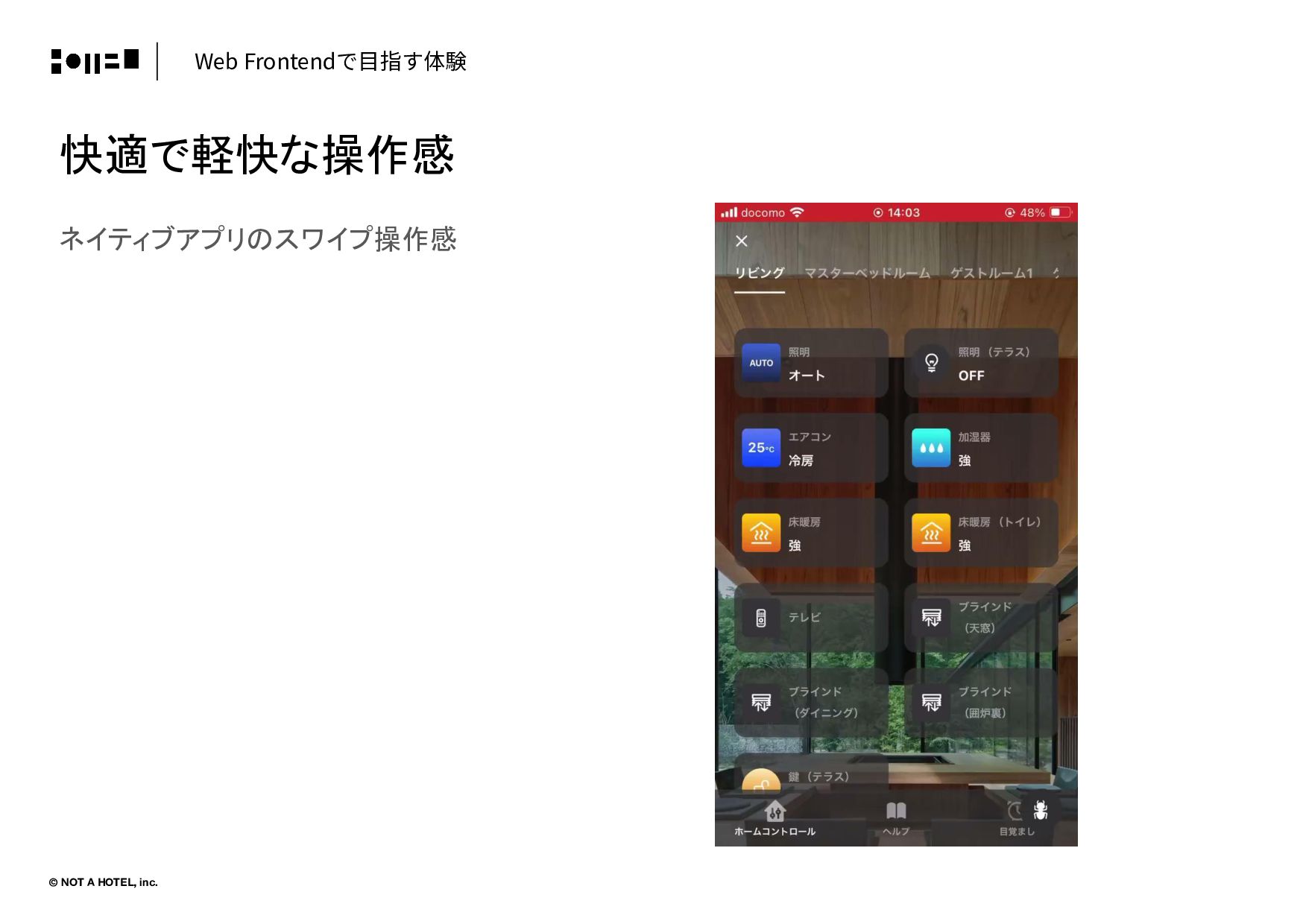 © NOT A HOTEL, inc. 快適で軽快な操作感 Home Controlまでが遠い Web Frontendで⽬指す体験