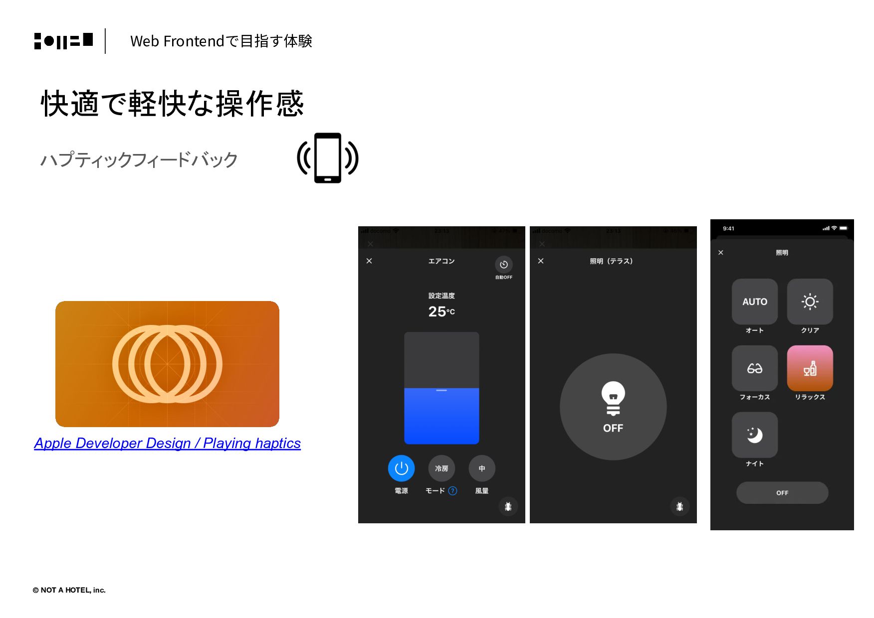 © NOT A HOTEL, inc. 快適で軽快な操作感 ハプティックフィードバック Web Frontendで⽬指す体験 Apple