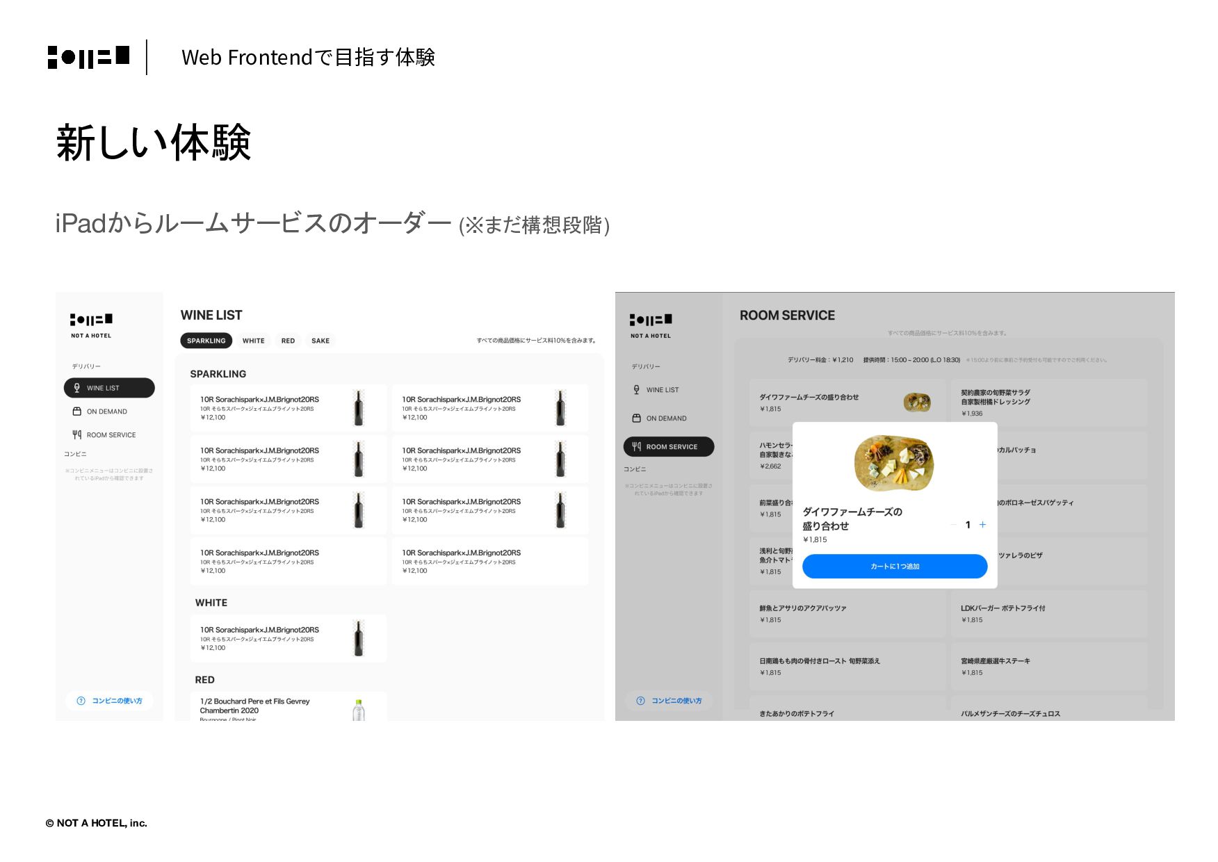 © NOT A HOTEL, inc. Web Frontendで⽬指す体験 新しい体験 iPadからルームサービスのオーダー (※まだ構想段階)