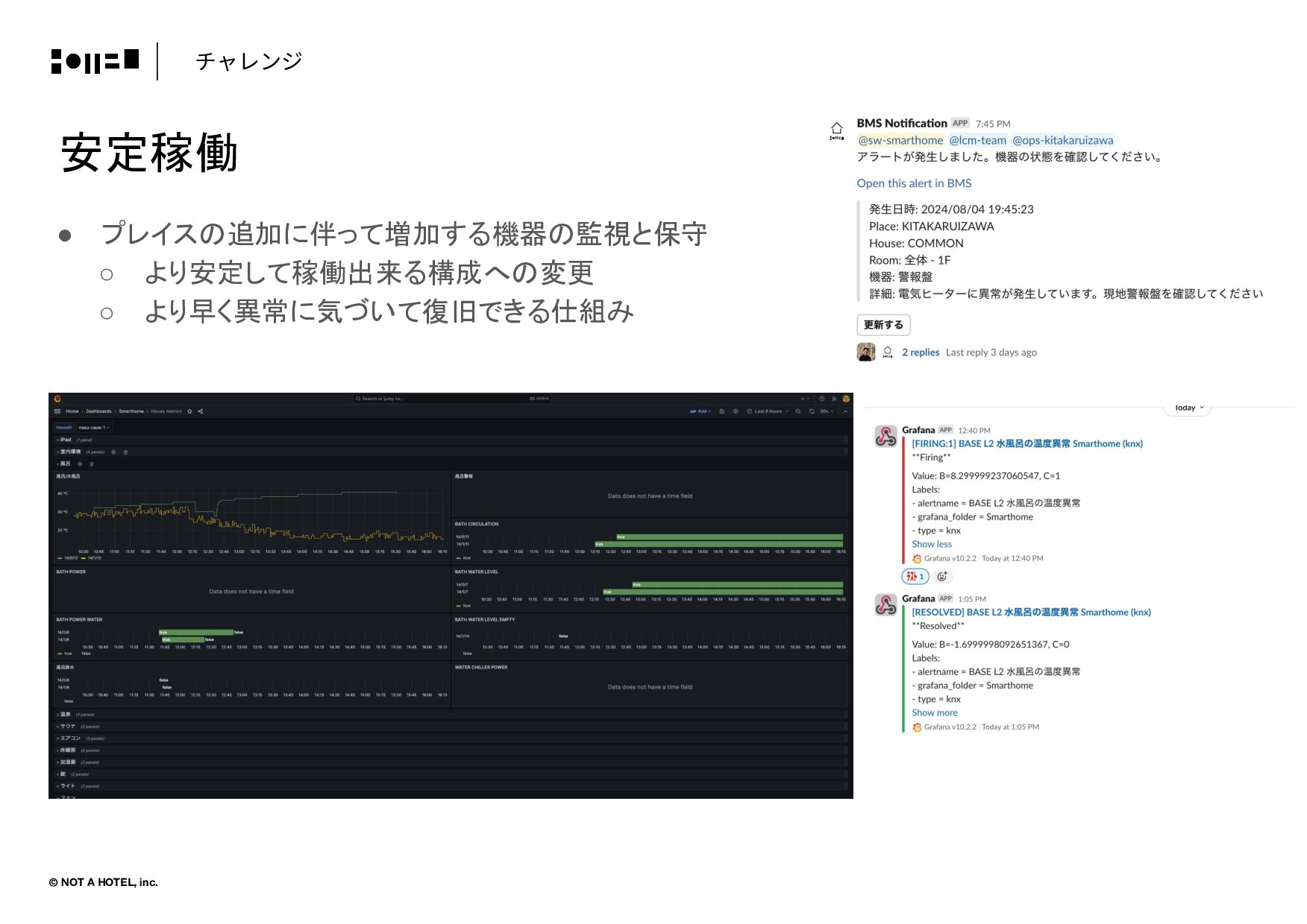 © NOT A HOTEL, inc. チャレンジ • プレイスの追加に伴って増加する機器の監視と保守 ◦ より安定して稼働出来る構成への変更