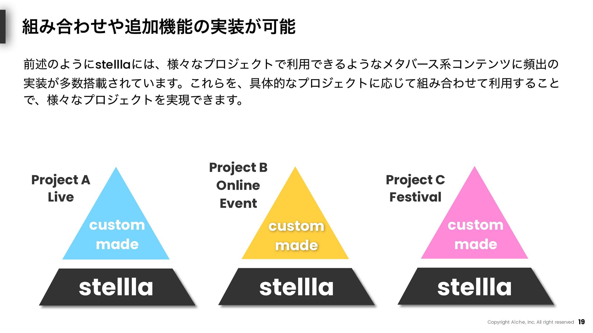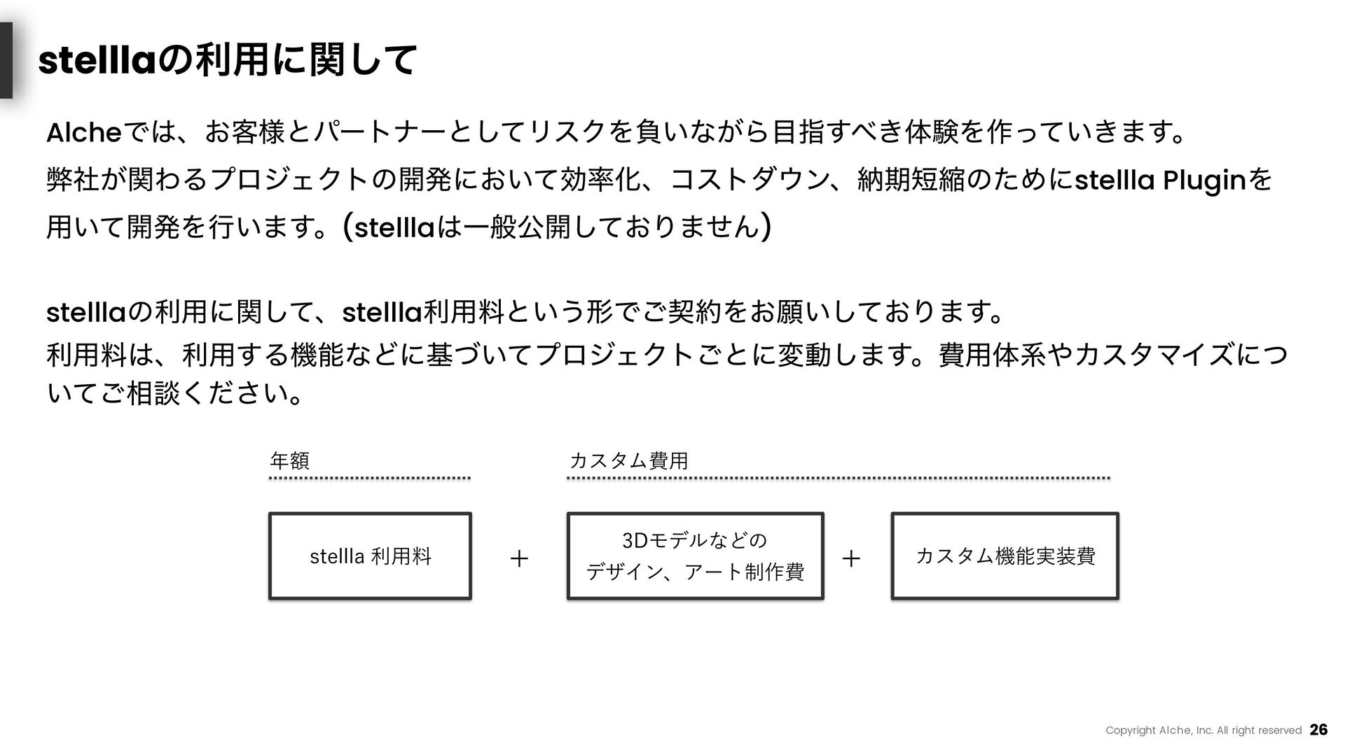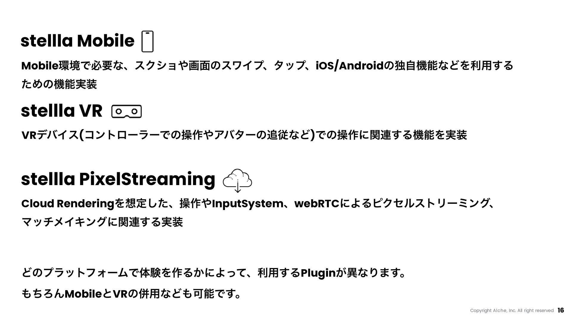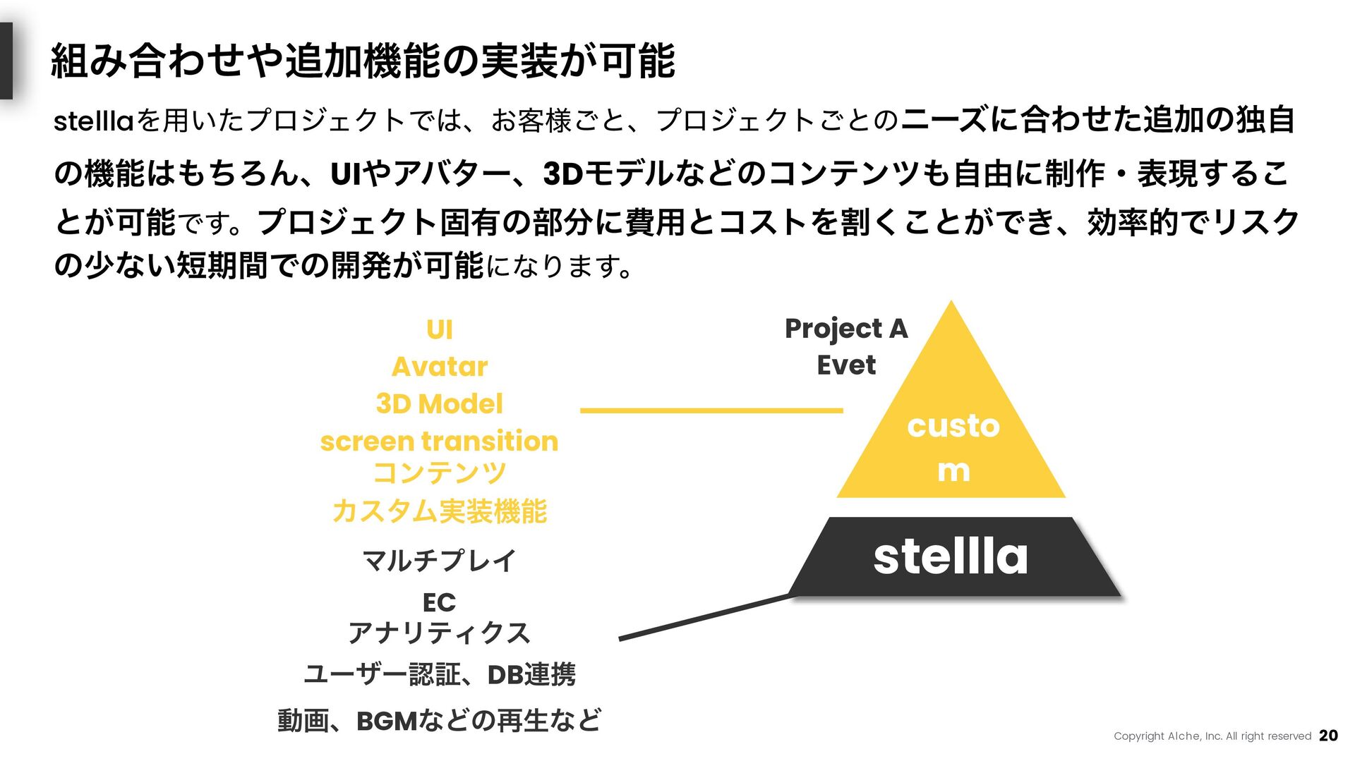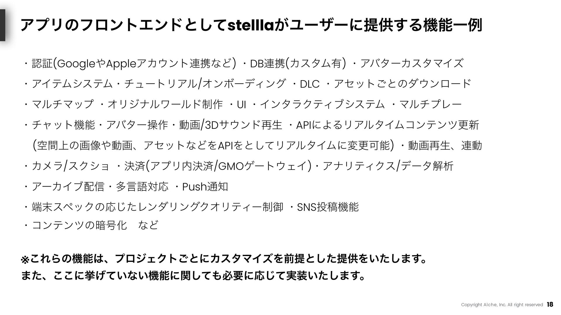 ɾΞΠςϜγεςϜɾνϡʔτϦΞϧ/ΦϯϘʔσΟϯά ɾDLC ɾΞηοτ͝ͱͷμϯϩʔυ ɾϚϧνϚοϓ ɾΦϦδφϧϫʔϧυ੍࡞ ɾUI ɾΠϯλϥΫςΟϒγεςϜ ɾϚϧνϓϨʔ ɾνϟοτػೳɾΞόλʔૢ࡞ɾಈը/3Dαϯυ࠶ੜ ɾAPIʹΑΔϦΞϧλΠϜίϯςϯπߋ৽ (্ۭؒͷը૾ಈըɺΞηοτͳͲΛAPIΛͱͯ͠ϦΞϧλΠϜʹมߋՄೳ) ɾಈը࠶ੜɺ࿈ಈ ɾΧϝϥ/εΫγϣ ɾܾࡁ(ΞϓϦܾࡁ/GMOήʔτΣΠ)ɾΞφϦςΟΫε/σʔλղੳ ɾΞʔΧΠϒ৴ɾଟݴޠରԠ ɾPush௨ ɾεϖοΫͷԠͨ͡ϨϯμϦϯάΫΦϦςΟʔ੍ޚ ɾSNSߘػೳ ɾίϯςϯπͷ҉߸ԽɹͳͲ ※͜ΕΒͷػೳɺϓϩδΣΫτ͝ͱʹΧελϚΠζΛલఏͱͨ͠ఏڙΛ͍ͨ͠·͢ɻ ·ͨɺ͜͜ʹڍ͍͛ͯͳ͍ػೳʹؔͯ͠ඞཁʹԠ࣮͍ͯͨ͡͠·͢ɻ ΞϓϦͷϑϩϯτΤϯυͱͯ͠stellla͕Ϣʔβʔʹఏڙ͢ΔػೳҰྫ