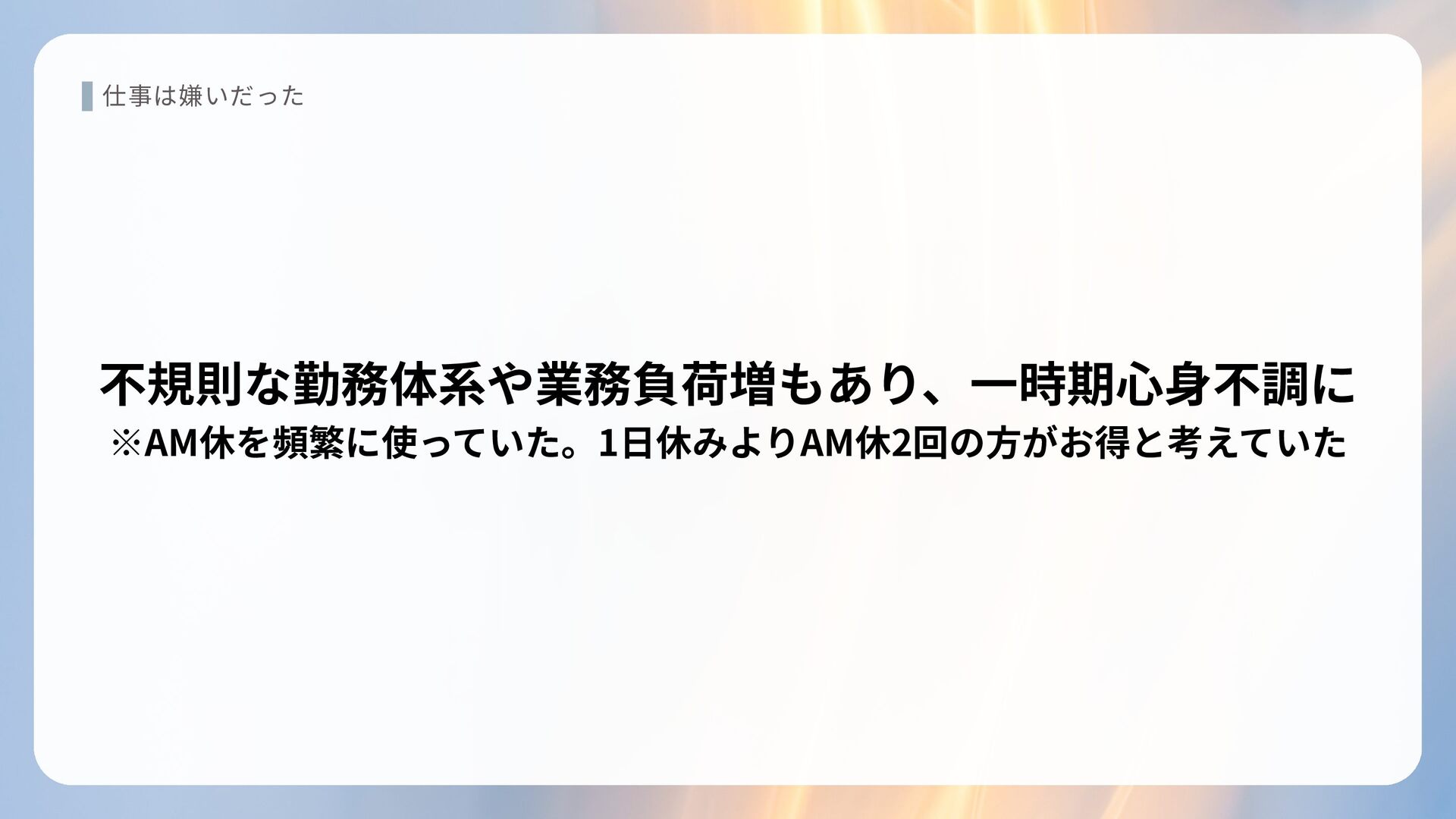 仕事は嫌いだった 不規則な勤務体系や業務負荷増もあり、一時期心身不調に ※AM休を頻繁に使っていた。1日休みよりAM休2回の方がお得と考えていた