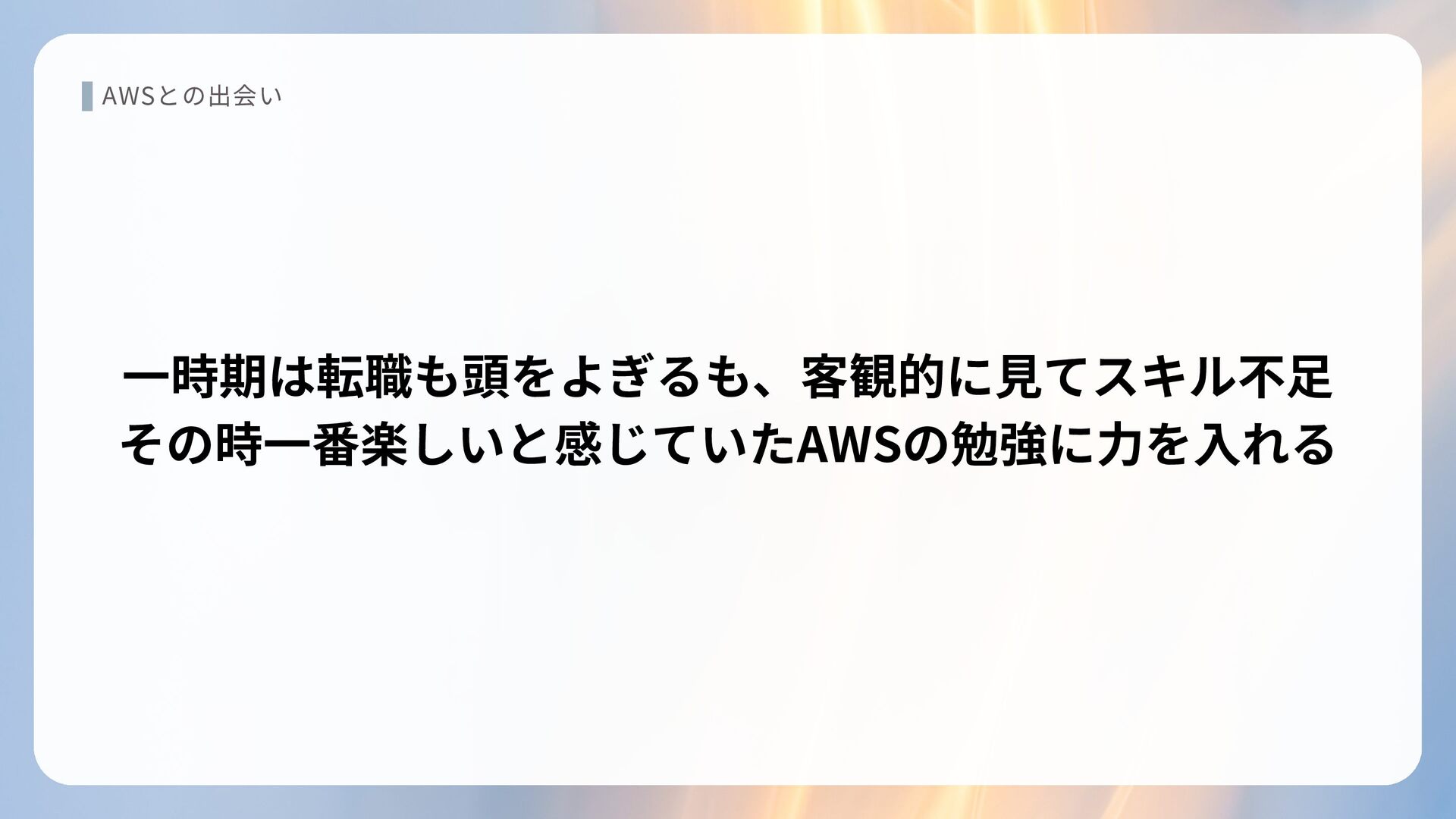 AWSとの出会い 一時期は転職も頭をよぎるも、客観的に見てスキル不足 その時一番楽しいと感じていたAWSの勉強に力を入れる