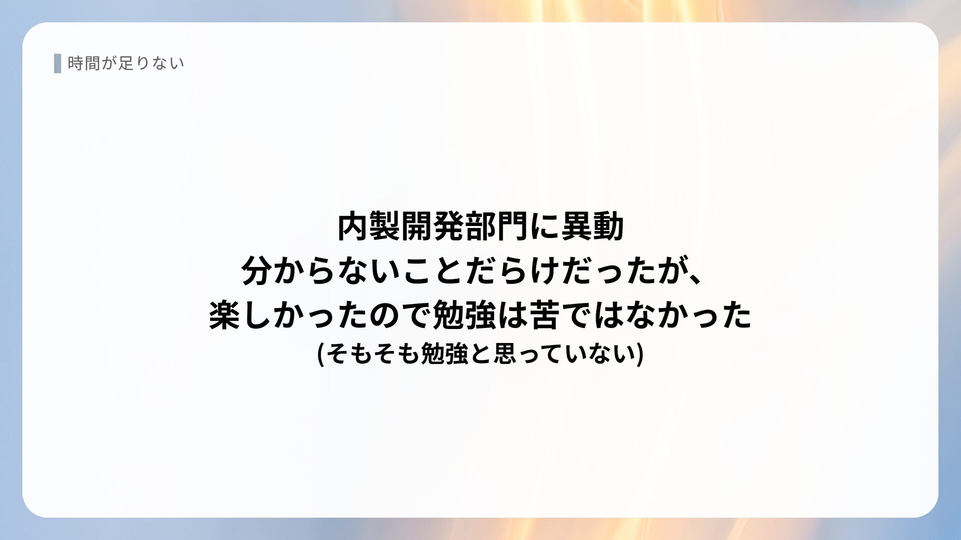 時間が足りない 内製開発部門に異動 分からないことだらけだったが、 楽しかったので勉強は苦ではなかった (そもそも勉強と思っていない)