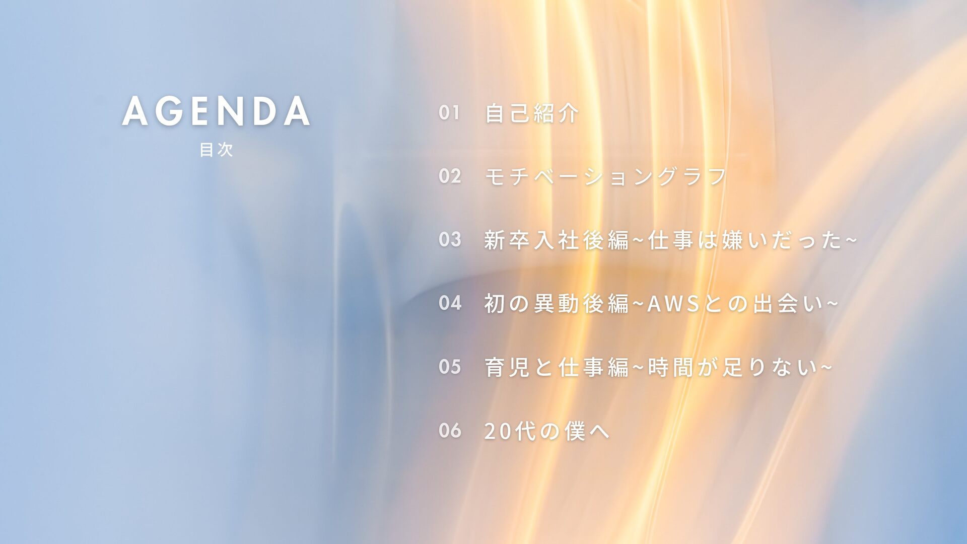 D A 01 01 自己紹介 自己紹介 目 次 02 02 モチベーショングラフ モチベーショングラフ 03 03 新卒入社後編~仕事は嫌いだった~ 新卒入社後編~仕事は嫌いだった~ 05 05 育児と仕事編~時間が足りない~ 育児と仕事編~時間が足りない~ 06 06 20代の僕へ 20代の僕へ 04 04 初の異動後編~AWSとの出会い~ 初の異動後編~AWSとの出会い~