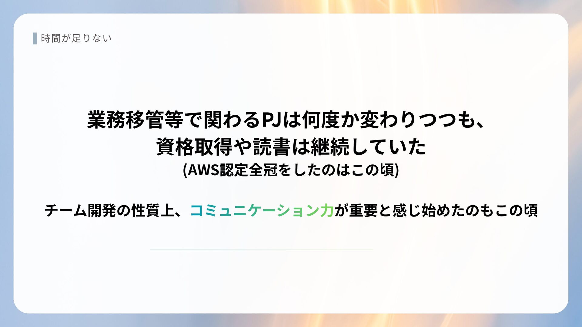 時間が足りない 業務移管等で関わるPJは何度か変わりつつも、 資格取得や読書は継続していた (AWS認定全冠をしたのはこの頃) チーム開発の性質上、 が重要と感じ始めたのもこの頃 コミュニケーション力 コミュニケーション力