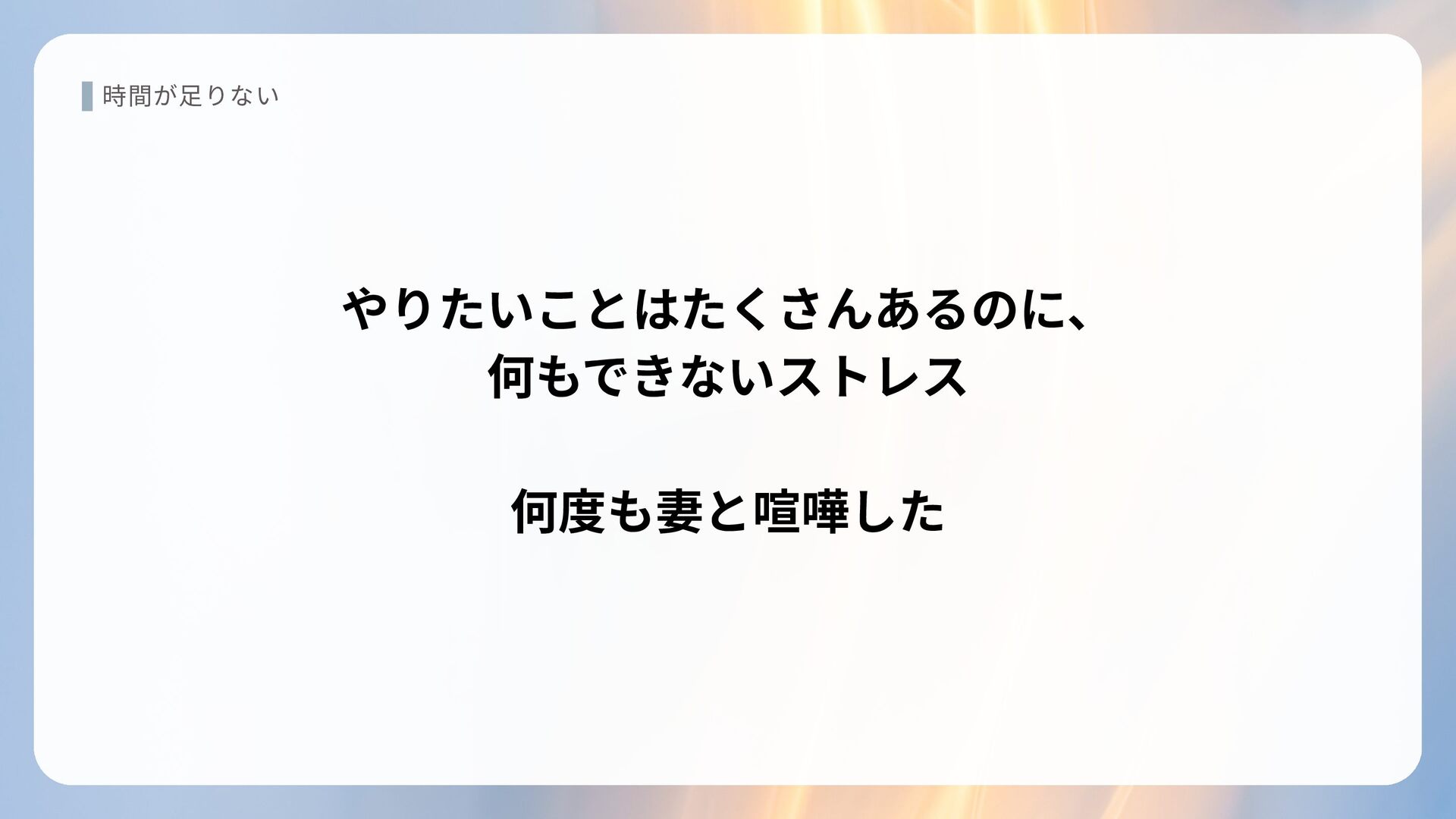 時間が足りない やりたいことはたくさんあるのに、 何もできないストレス 何度も妻と喧嘩した