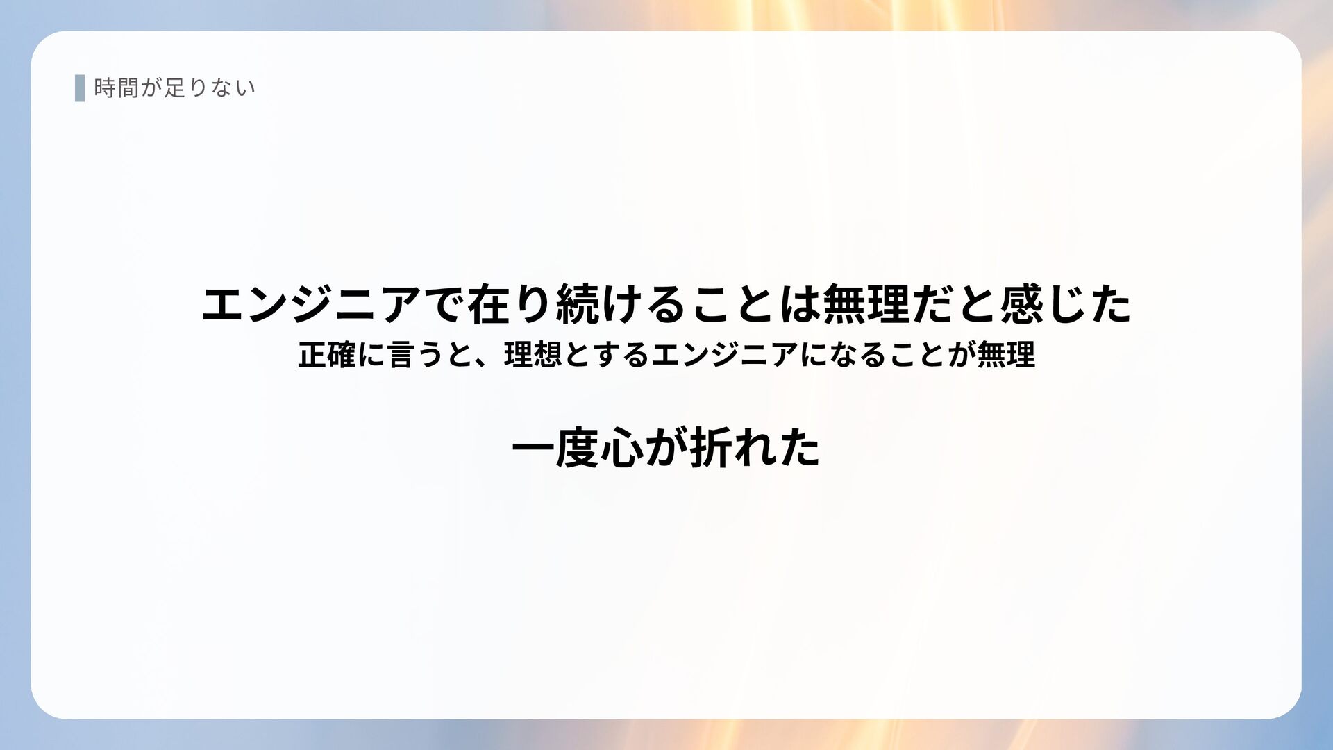 時間が足りない エンジニアで在り続けることは無理だと感じた 正確に言うと、理想とするエンジニアになることが無理 一度心が折れた