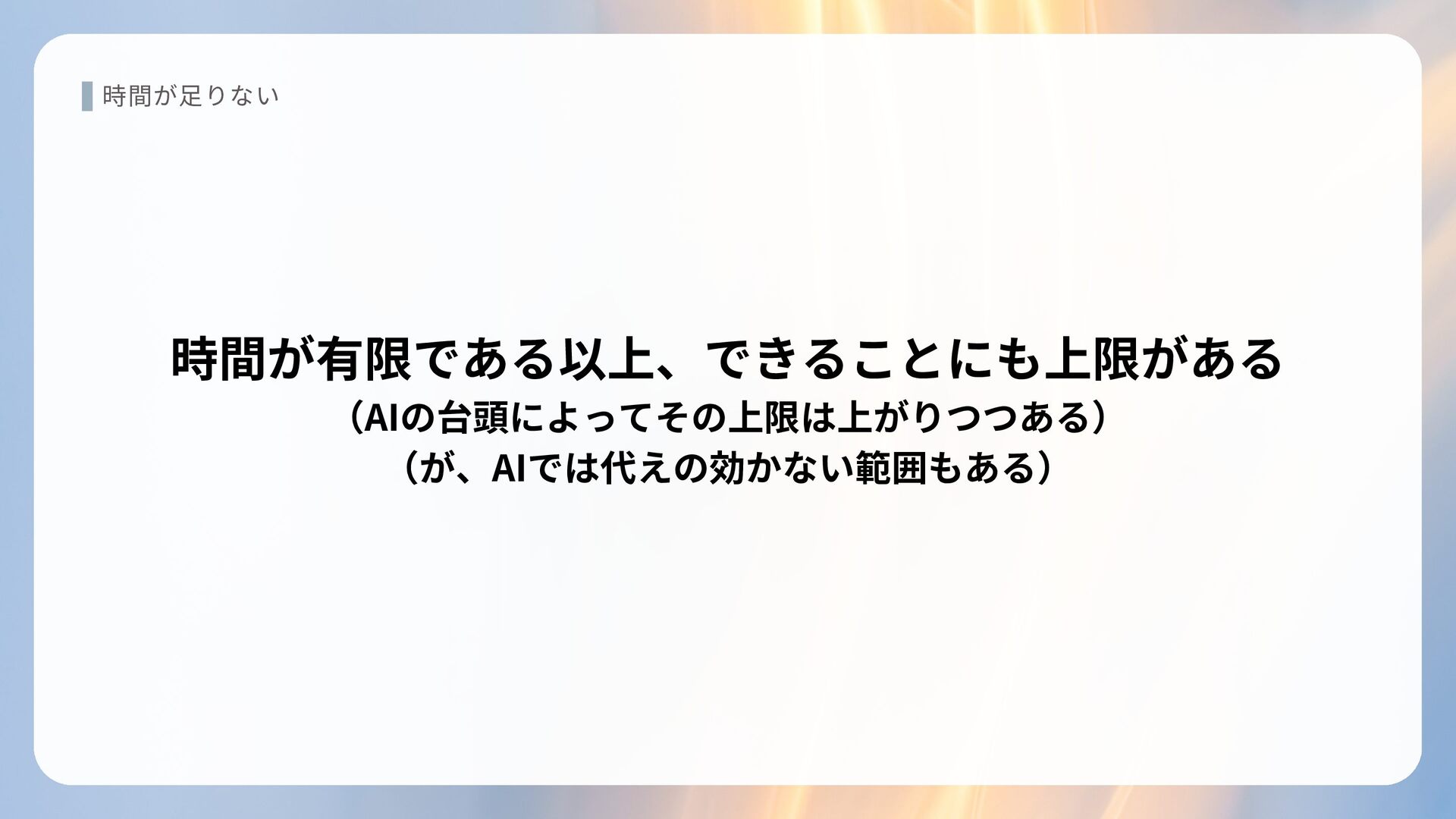 時間が足りない 時間が有限である以上、できることにも上限がある (AIの台頭によってその上限は上がりつつある) (が、AIでは代えの効かない範囲もある)