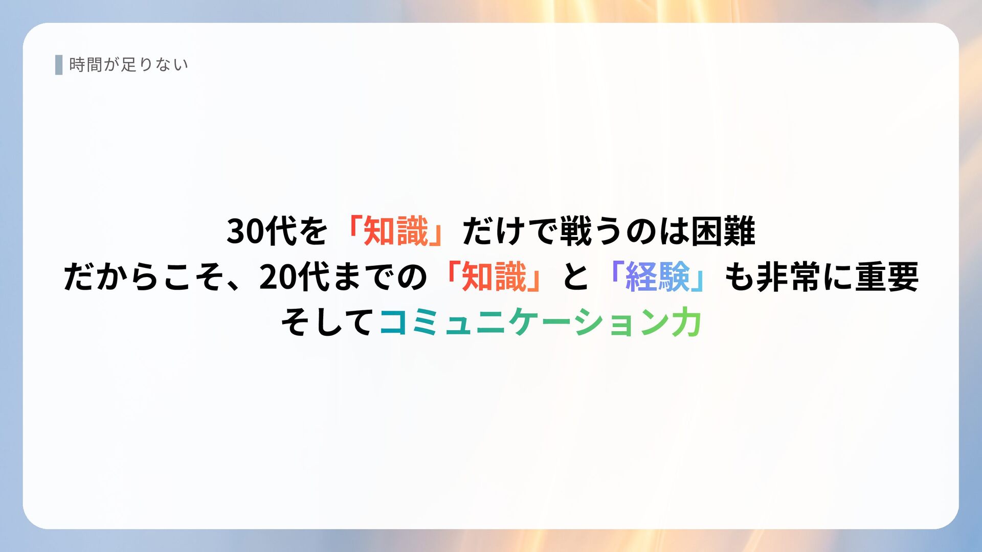 時間が足りない 30代を だけで戦うのは困難 だからこそ、20代までの と も非常に重要 そして 「知識」 「知識」 「知識」