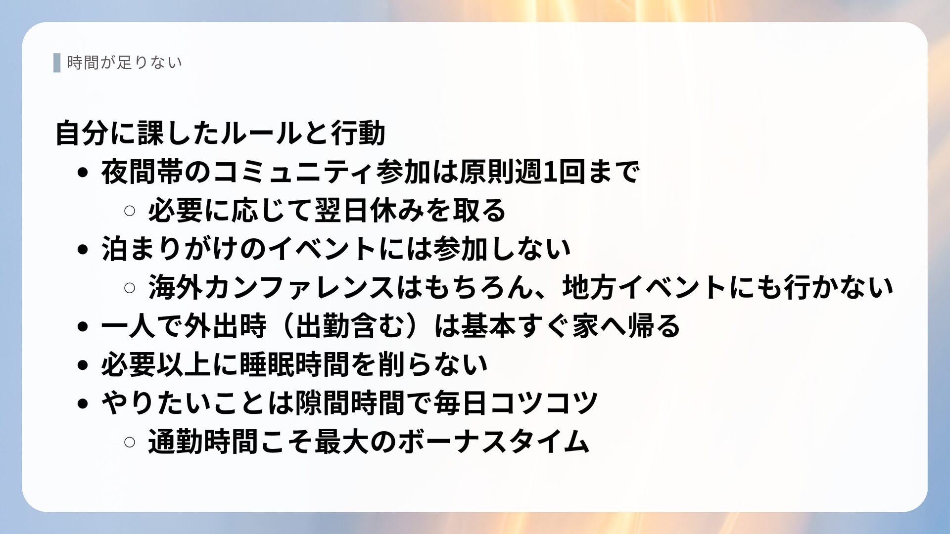 時間が足りない 自分に課したルールと行動 夜間帯のコミュニティ参加は原則週1回まで 必要に応じて翌日休みを取る 泊まりがけのイベントには参加しない 海外カンファレンスはもちろん、地方イベントにも行かない 一人で外出時(出勤含む)は基本すぐ家へ帰る 必要以上に睡眠時間を削らない やりたいことは隙間時間で毎日コツコツ 通勤時間こそ最大のボーナスタイム