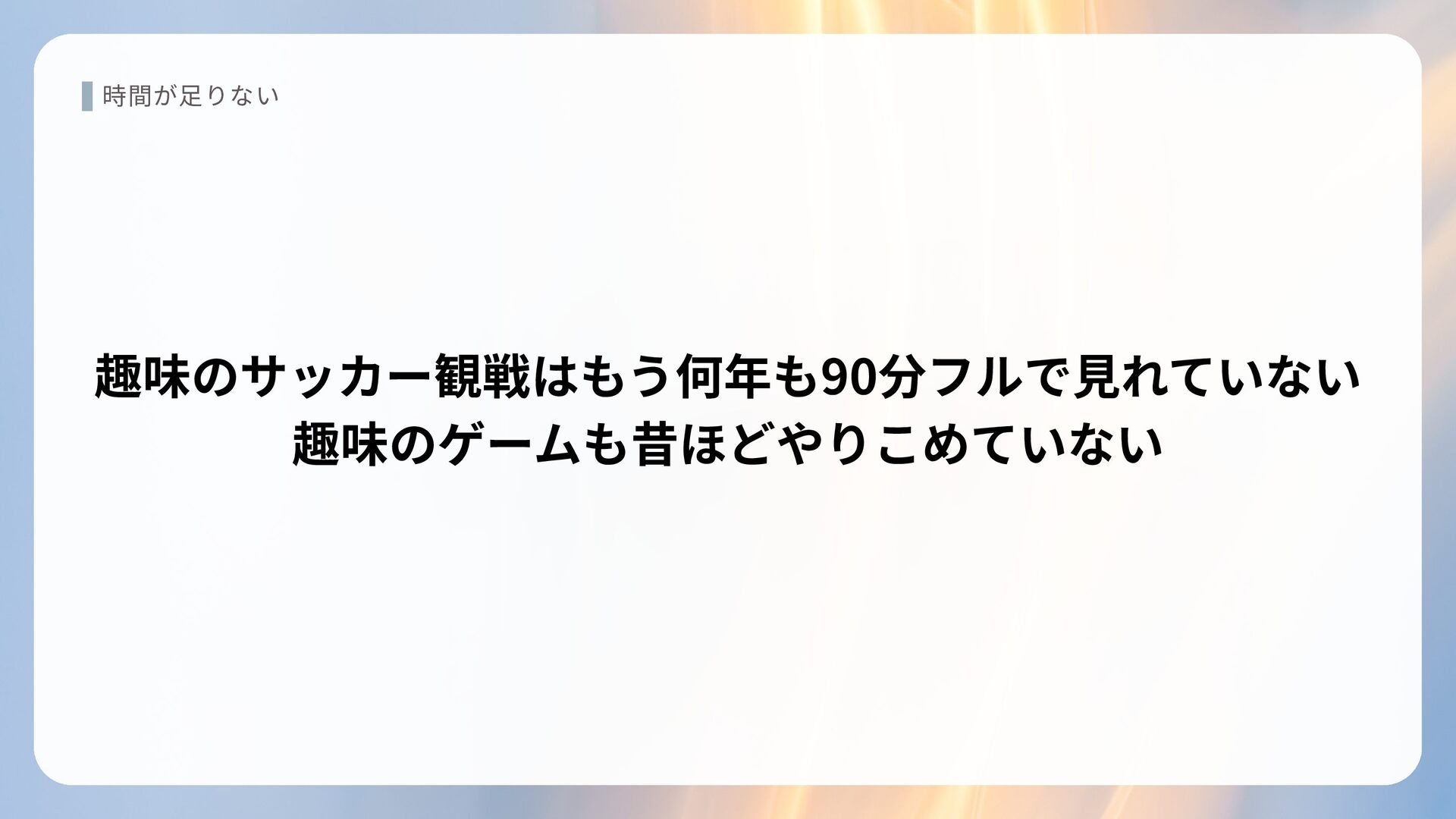 時間が足りない 趣味のサッカー観戦はもう何年も90分フルで見れていない 趣味のゲームも昔ほどやりこめていない