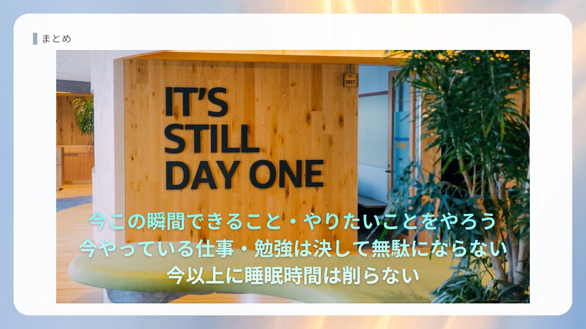 まとめ 今この瞬間できること・やりたいことをやろう 今やっている仕事・勉強は決して無駄にならない 今以上に睡眠時間は削らない 今この瞬間できること・やりたいことをやろう 今この瞬間できること・やりたいことをやろう 今やっている仕事・勉強は決して無駄にならない 今やっている仕事・勉強は決して無駄にならない 今以上に睡眠時間は削らない 今以上に睡眠時間は削らない