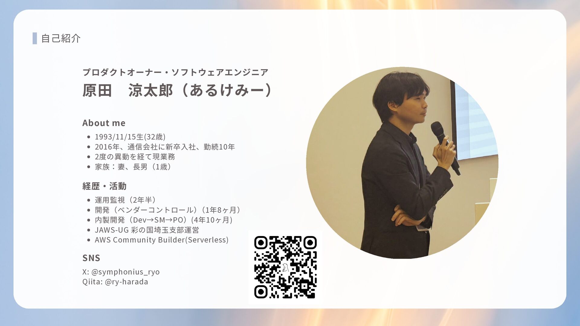 家族:妻、長男(1歳) 運用監視(2年半) 開発(ベンダーコントロール) (1年8ヶ月) 内製開発(Dev→SM→PO)(4年10ヶ月) JAWS-UG 彩の国埼玉支部運営 AWS Community Builder(Serverless) X: @symphonius_ryo Qiita: @ry-harada