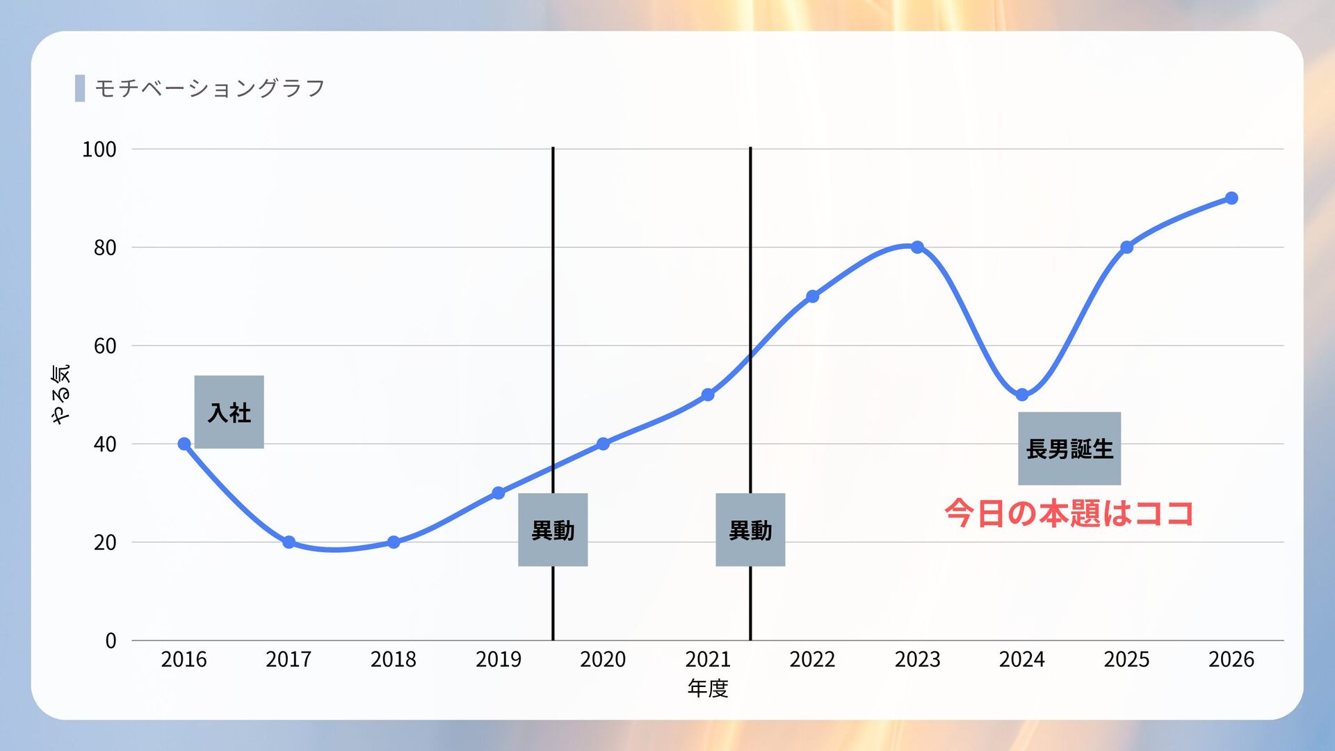 2024 2025 2026 0 20 40 60 80 100 入社 異動 異動 長男誕生 モチベーショングラフ 今日の本題はココ