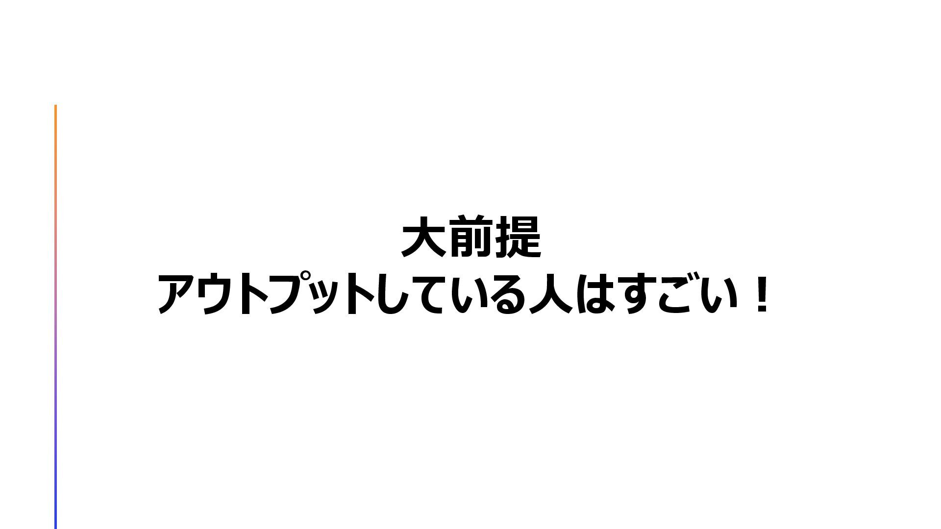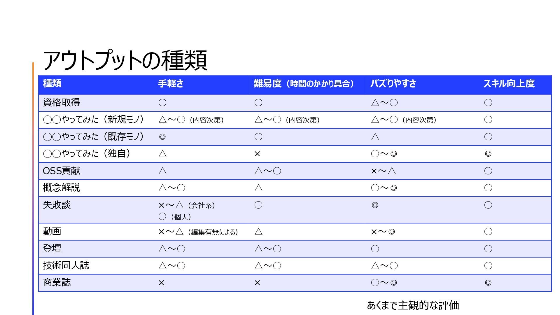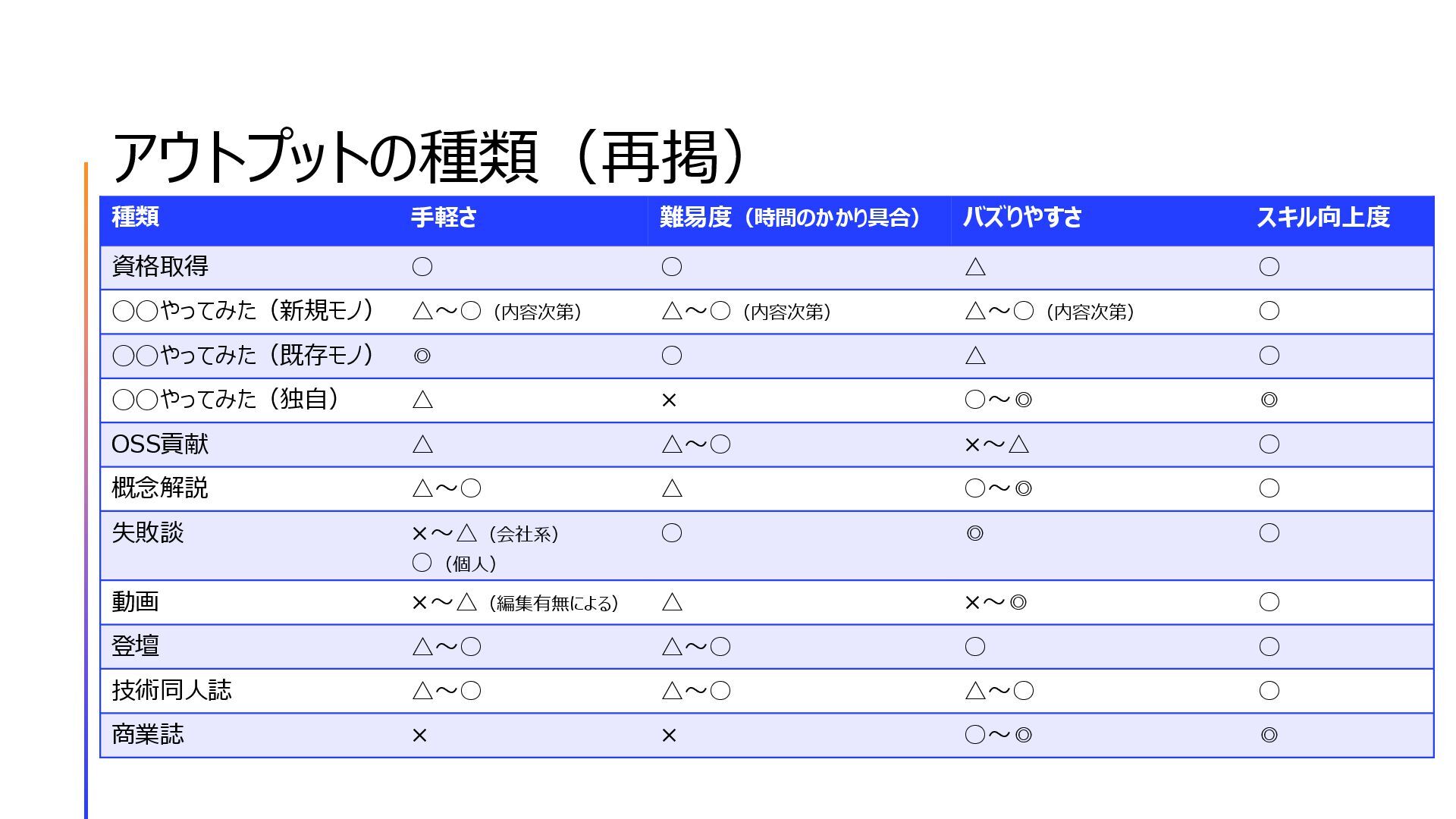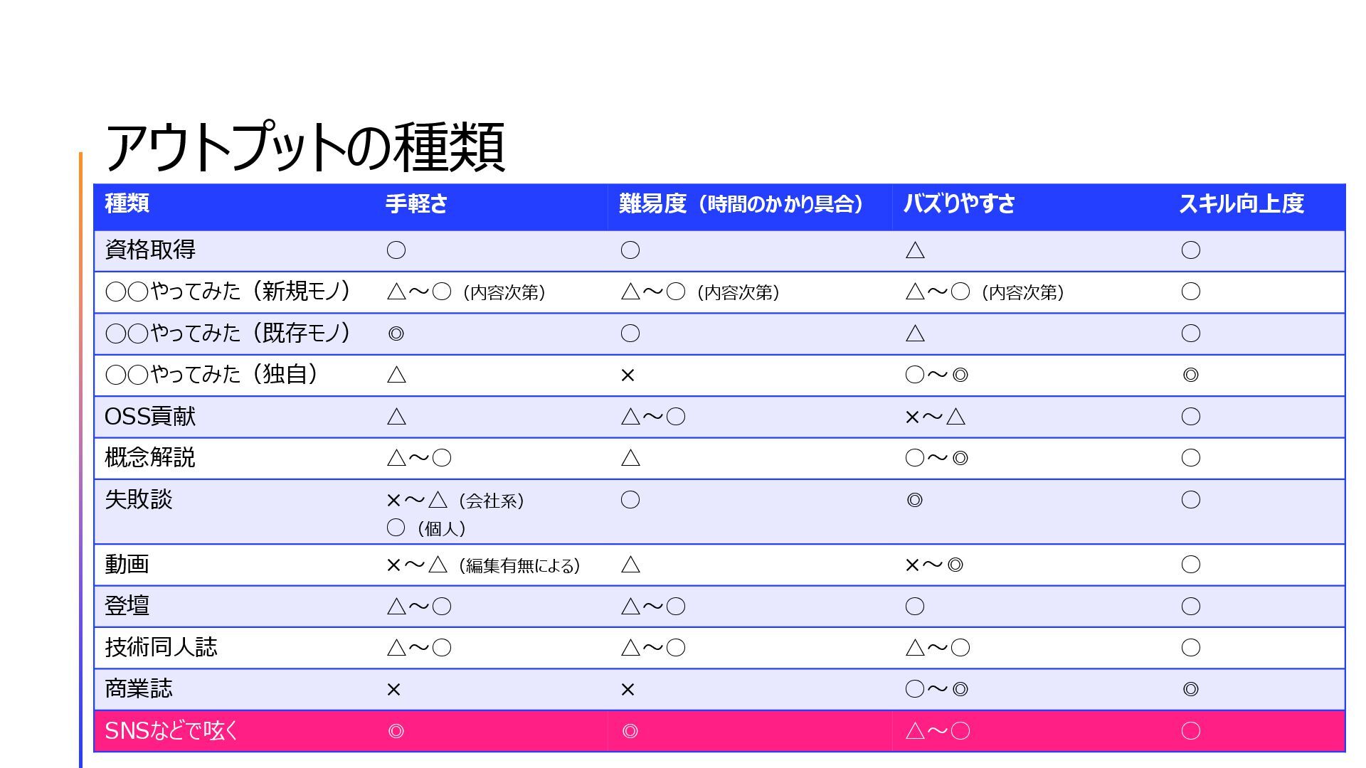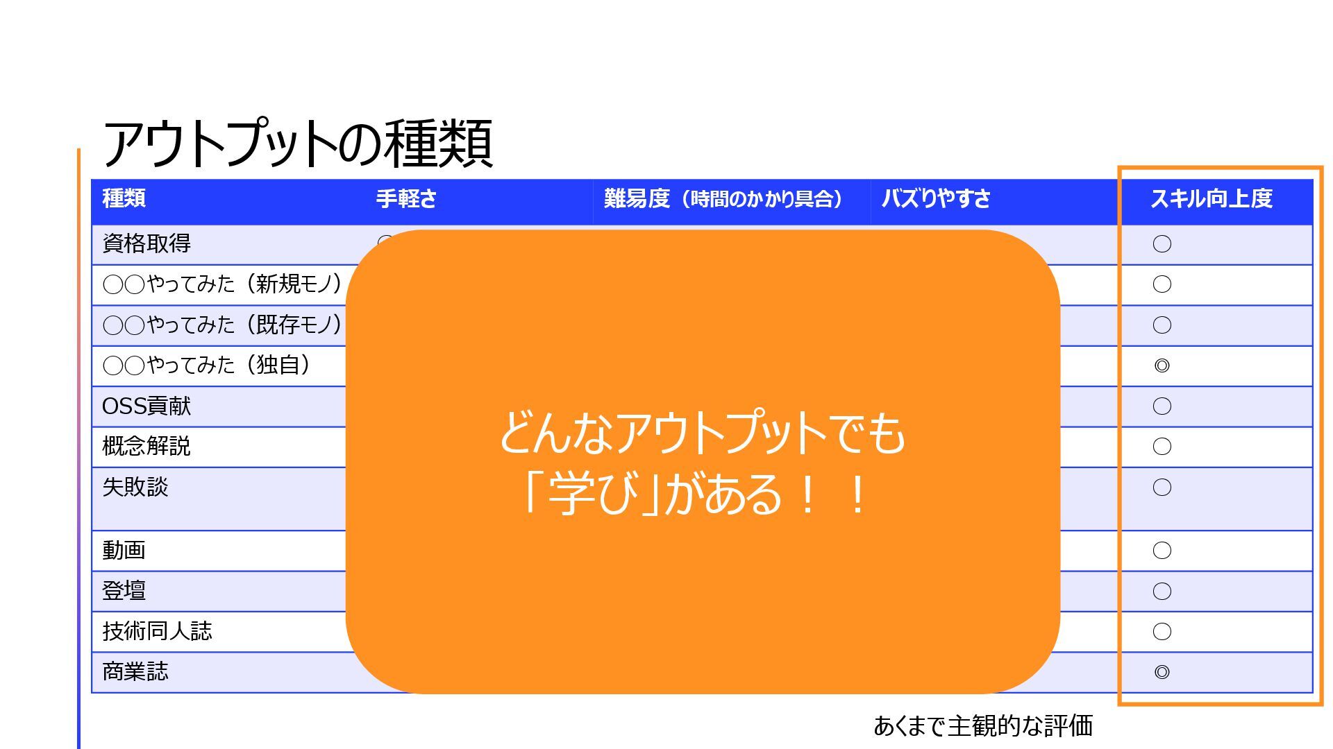 ◦ ◯◯やってみた(新規モノ) △〜◦(内容次第) △〜◦(内容次第) △〜◦(内容次第) ◦ ◯◯やってみた(既存モノ) ◎ ◦ △ ◦ ◯◯やってみた(独自) △ × ◦〜◎ ◎ OSS貢献 △ △〜◦ ×〜△ ◦ 概念解説 △〜◦ △ ◦〜◎ ◦ 失敗談 ×〜△(会社系) ◦(個人) ◦ ◎ ◦ 動画 ×〜△(編集有無による) △ ×〜◎ ◦ 登壇 △〜◦ △〜◦ ◦ ◦ 技術同人誌 △〜◦ △〜◦ △〜◦ ◦ 商業誌 × × ◦〜◎ ◎ あくまで主観的な評価 どんなアウトプットでも 「学び」がある!!