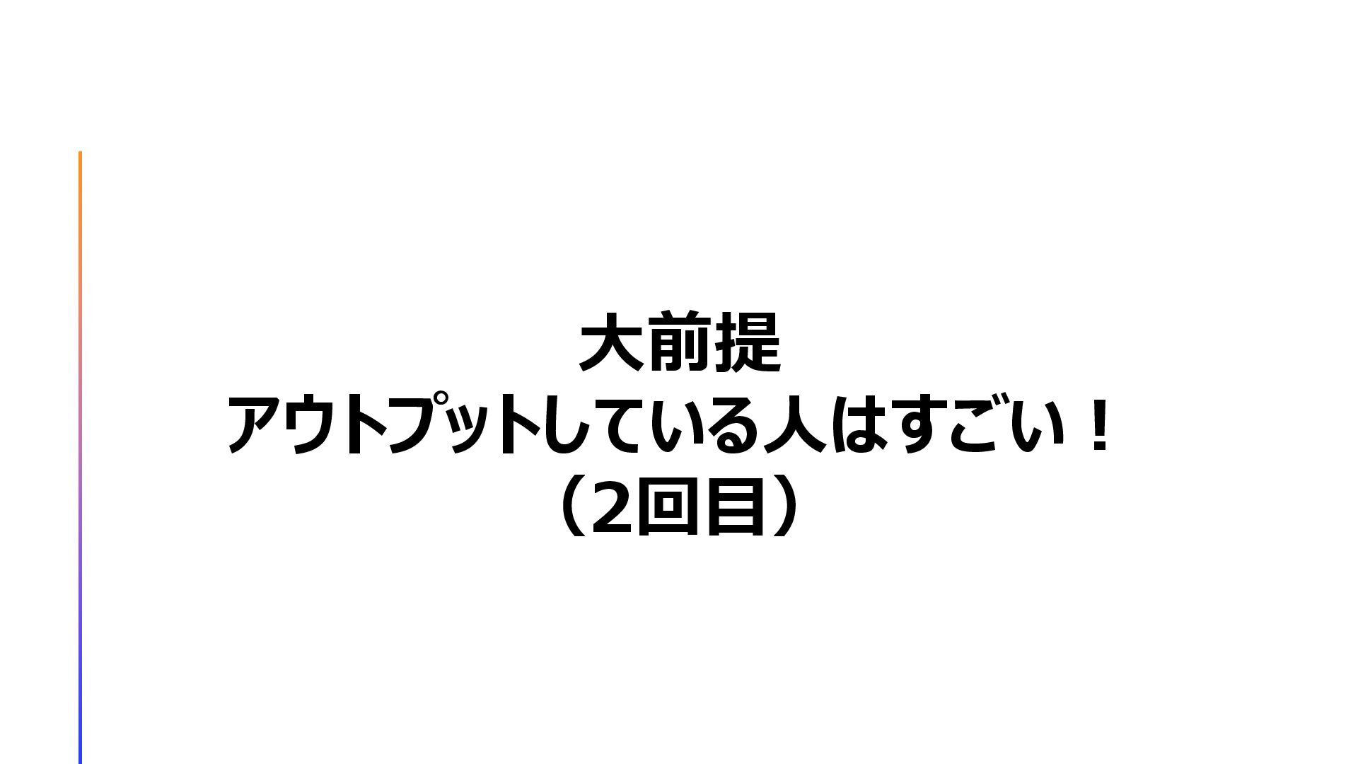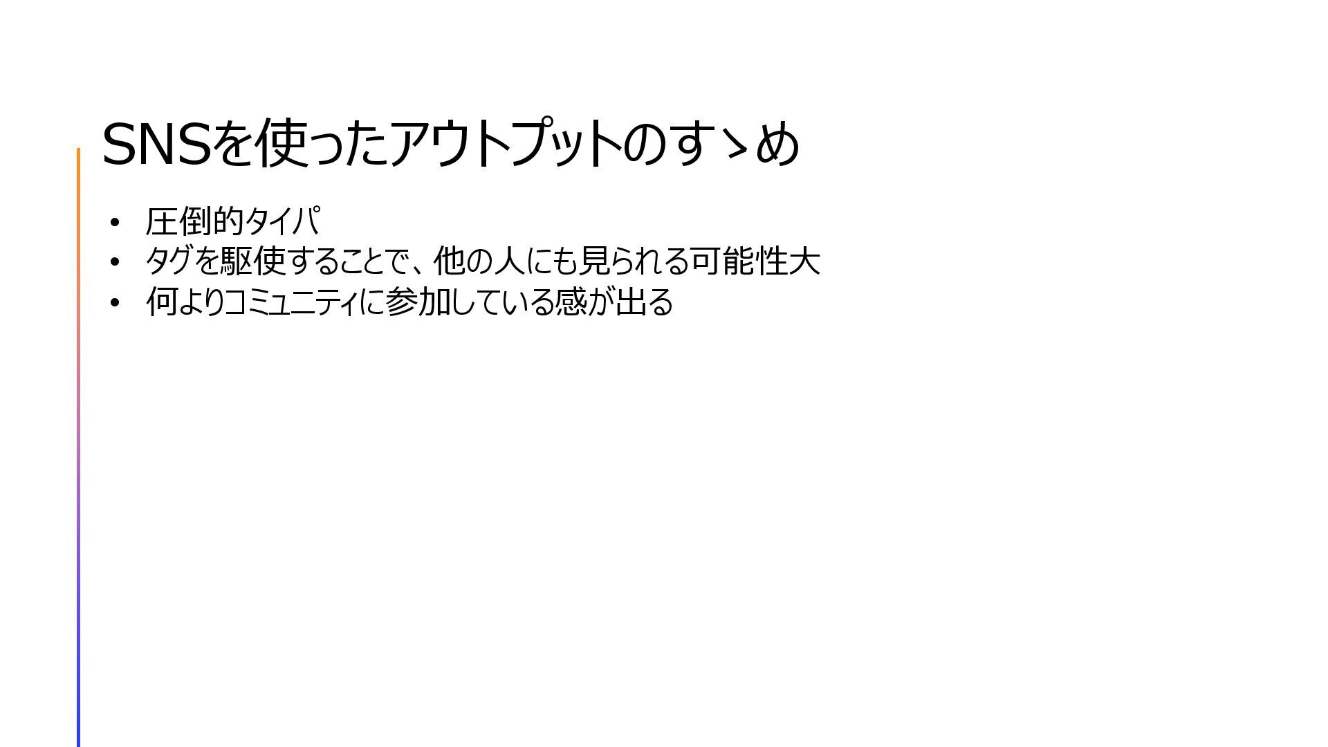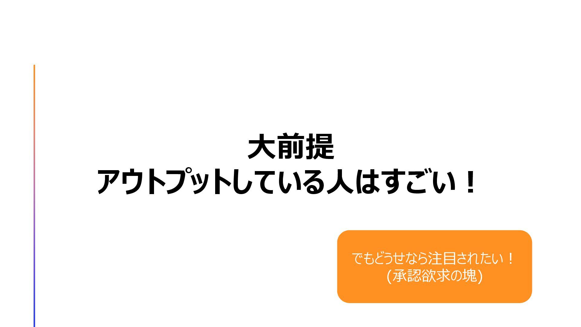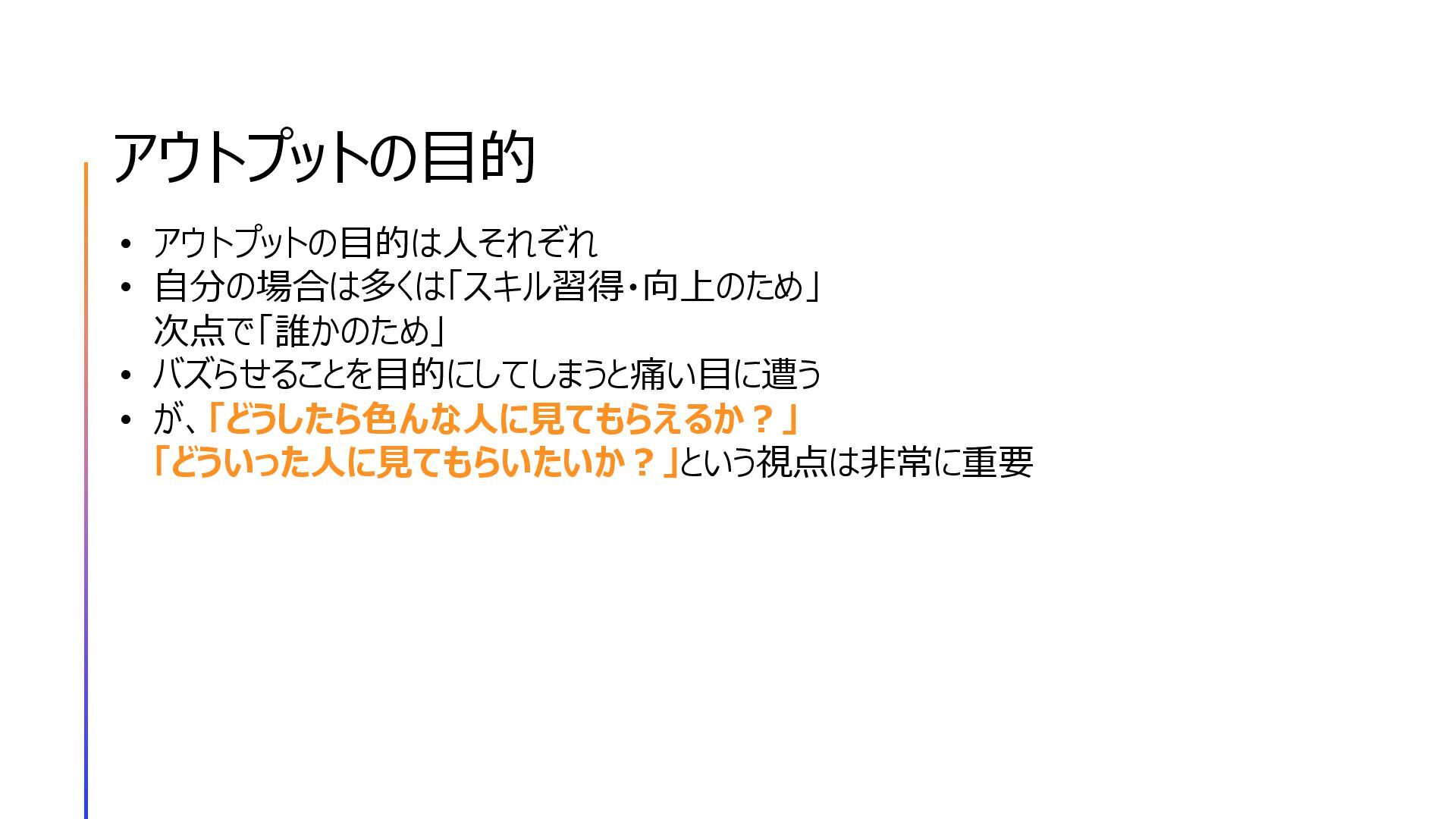◦ ◯◯やってみた(新規モノ) △〜◦(内容次第) △〜◦(内容次第) △〜◦(内容次第) ◦ ◯◯やってみた(既存モノ) ◎ ◦ △ ◦ ◯◯やってみた(独自) △ × ◦〜◎ ◎ OSS貢献 △ △〜◦ ×〜△ ◦ 概念解説 △〜◦ △ ◦〜◎ ◦ 失敗談 ×〜△(会社系) ◦(個人) ◦ ◎ ◦ 動画 ×〜△(編集有無による) △ ×〜◎ ◦ 登壇 △〜◦ △〜◦ ◦ ◦ 技術同人誌 △〜◦ △〜◦ △〜◦ ◦ 商業誌 × × ◦〜◎ ◎ あくまで主観的な評価 どんなアウトプットでも 「学び」がある!!