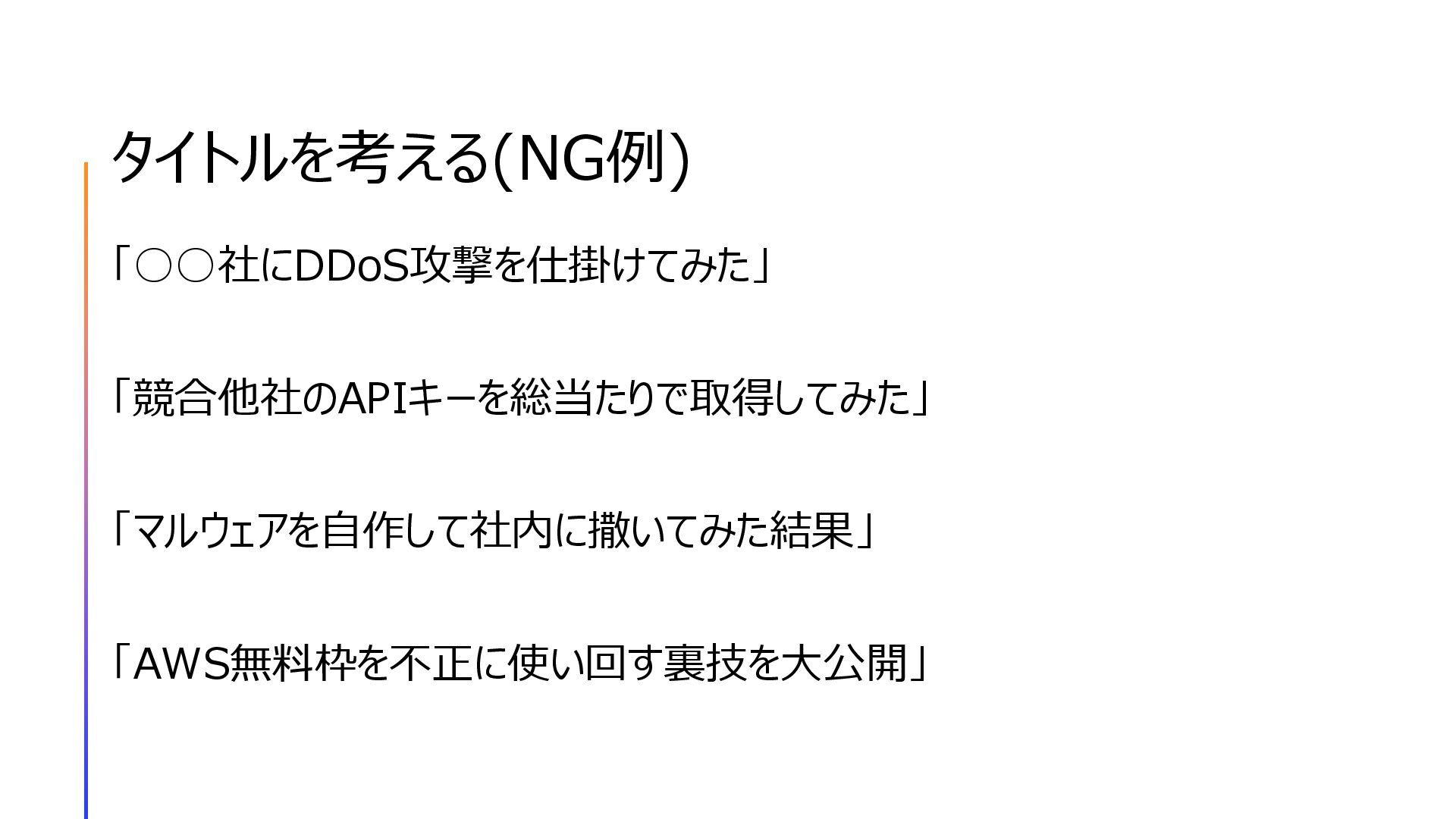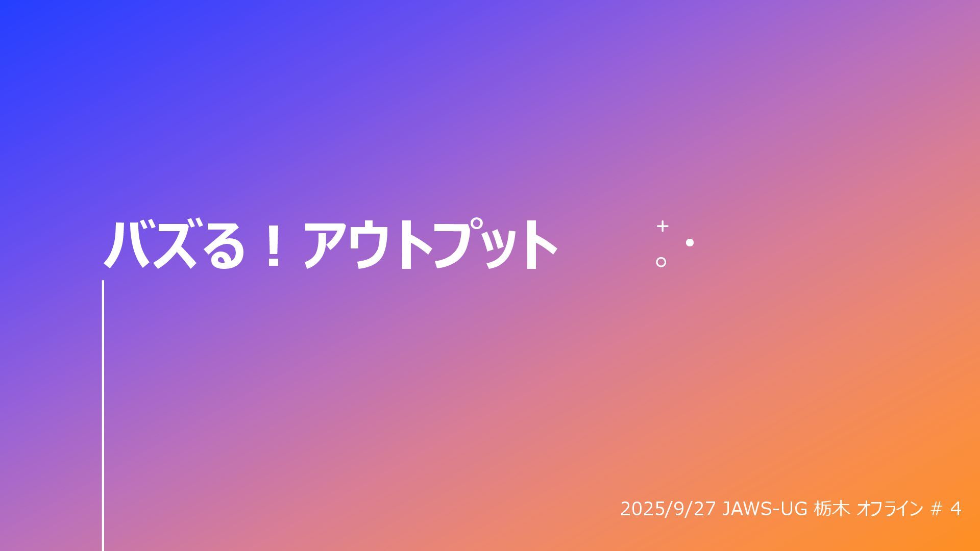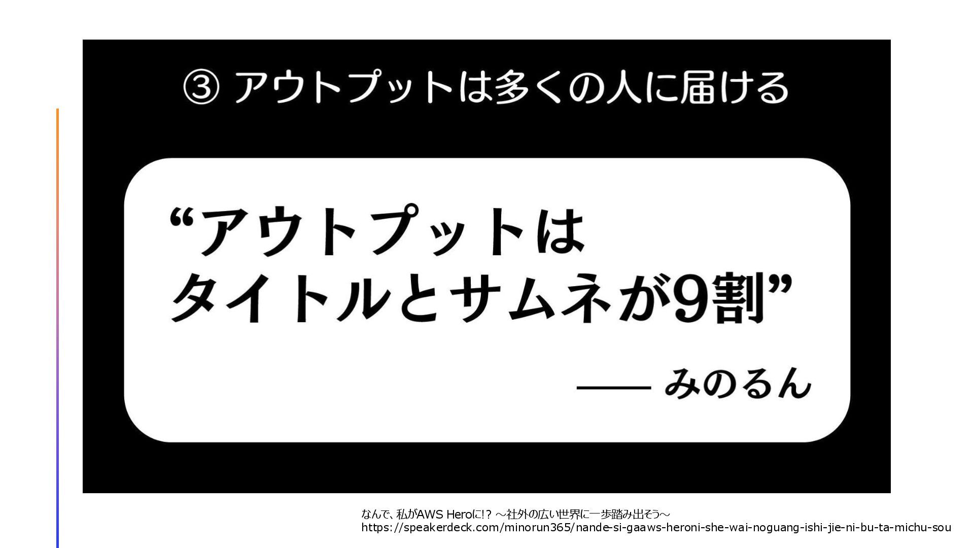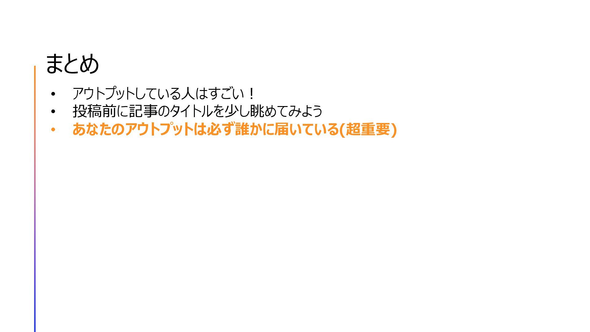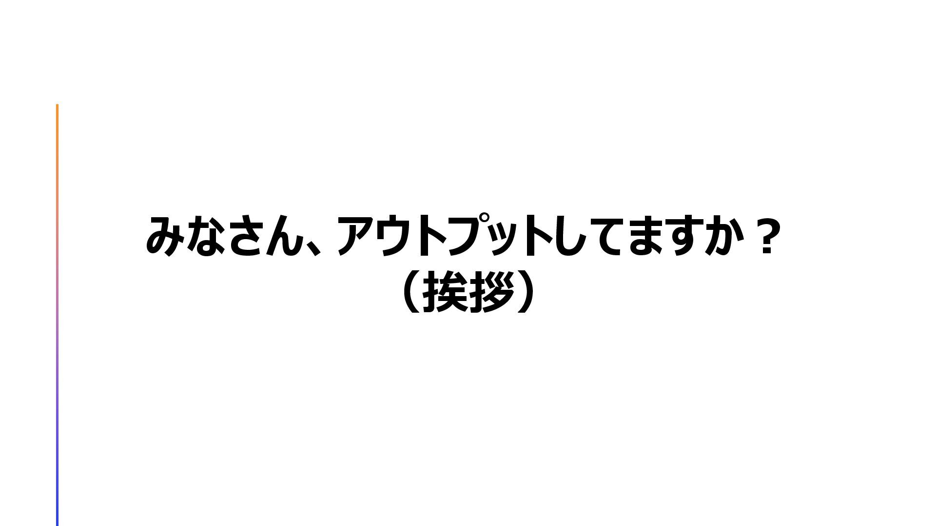 ◦ ◯◯やってみた(新規モノ) △〜◦(内容次第) △〜◦(内容次第) △〜◦(内容次第) ◦ ◯◯やってみた(既存モノ) ◎ ◦ △ ◦ ◯◯やってみた(独自) △ × ◦〜◎ ◎ OSS貢献 △ △〜◦ ×〜△ ◦ 概念解説 △〜◦ △ ◦〜◎ ◦ 失敗談 ×〜△(会社系) ◦(個人) ◦ ◎ ◦ 動画 ×〜△(編集有無による) △ ×〜◎ ◦ 登壇 △〜◦ △〜◦ ◦ ◦ 技術同人誌 △〜◦ △〜◦ △〜◦ ◦ 商業誌 × × ◦〜◎ ◎ あくまで主観的な評価 どんなアウトプットでも 「学び」がある!!