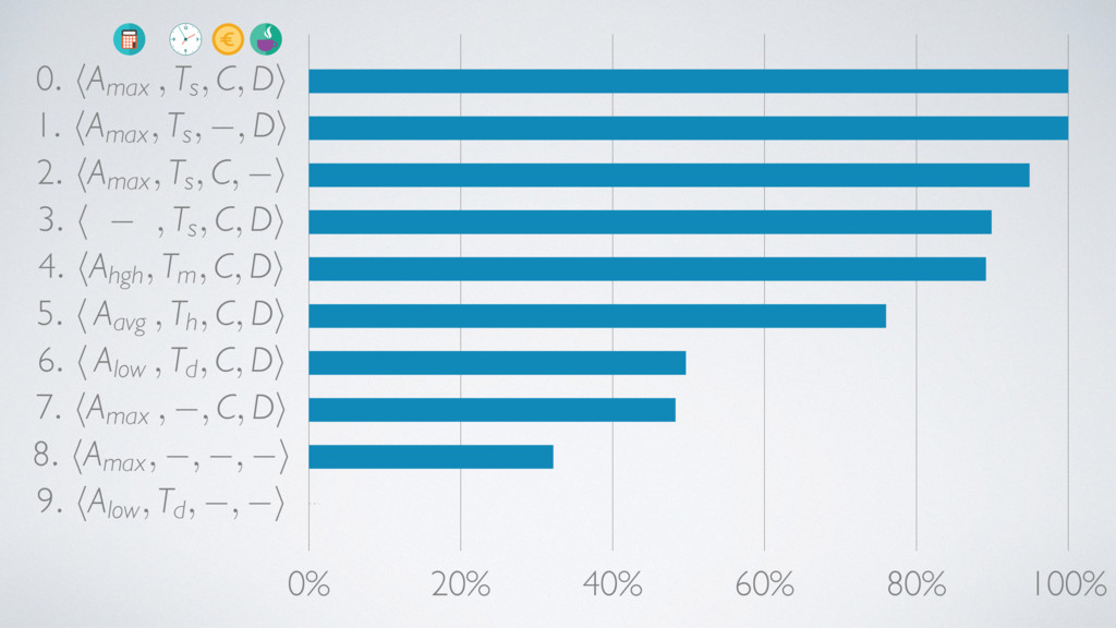 D⟩ 2. ⟨Amax, Ts, C, −⟩ 3. ⟨ − , Ts, C, D⟩ 4. ⟨Ahgh, Tm, C, D⟩ 5. ⟨ Aavg , Th, C, D⟩ 6. ⟨ Alow , Td, C, D⟩ 7. ⟨Amax , −, C, D⟩ 8. ⟨Amax, −, −, −⟩ 9. ⟨Alow, Td, −, −⟩ 0% 20% 40% 60% 80% 100%
