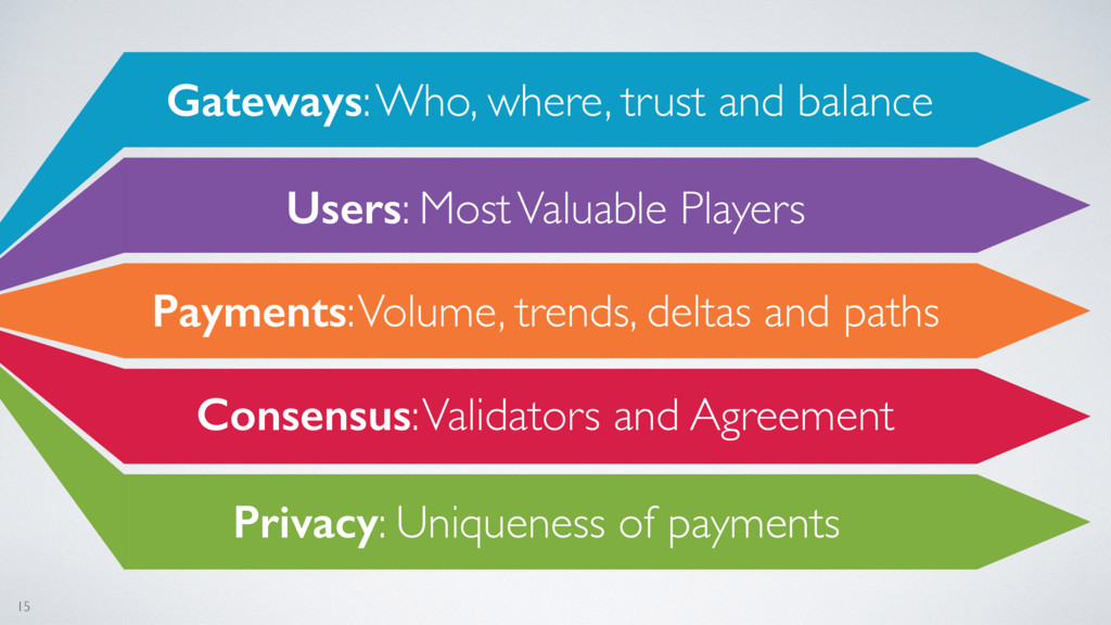 Players Payments: Volume, trends, deltas and paths Consensus: Validators and Agreement Privacy: Uniqueness of payments
