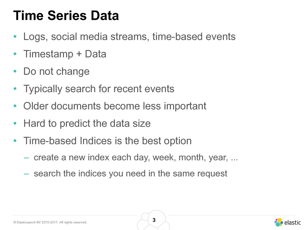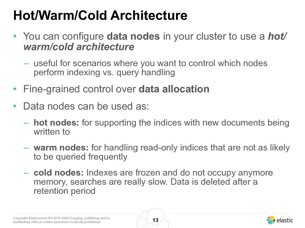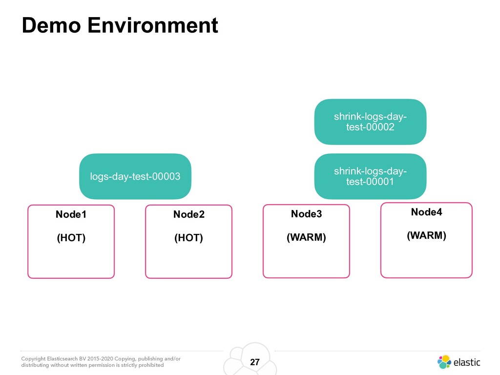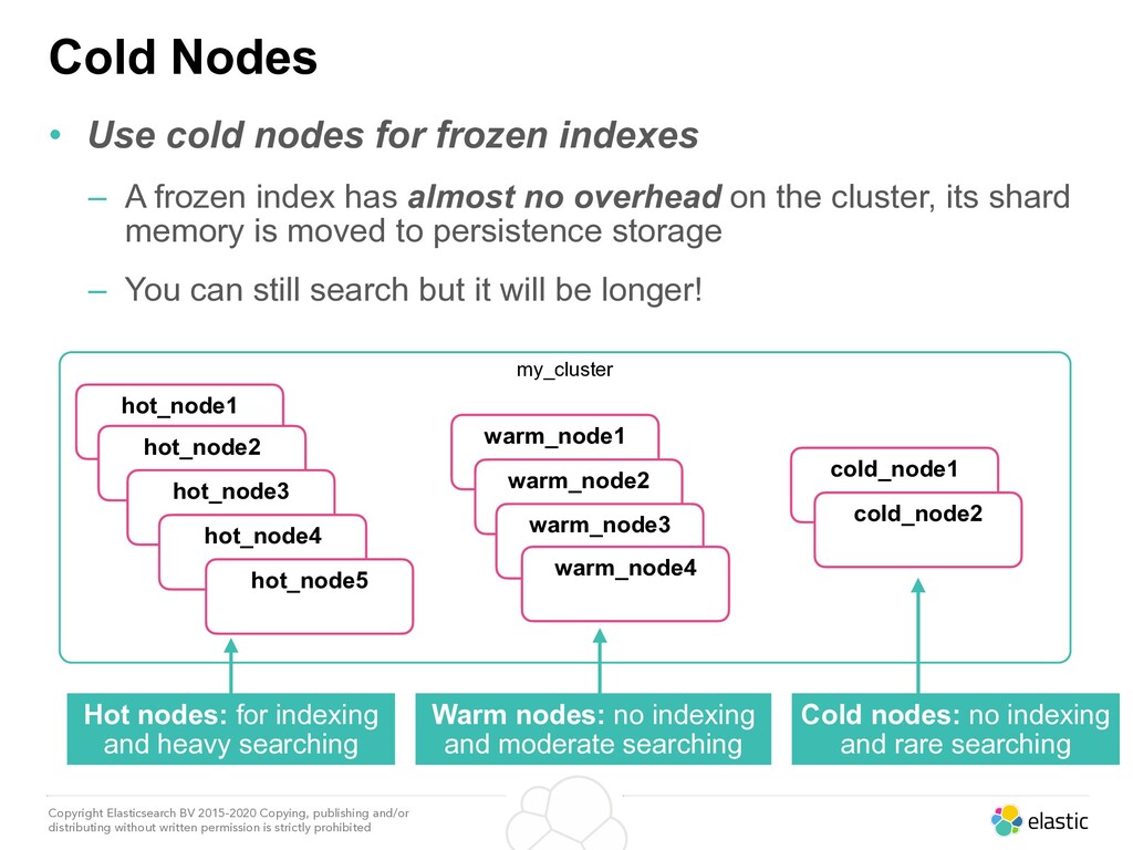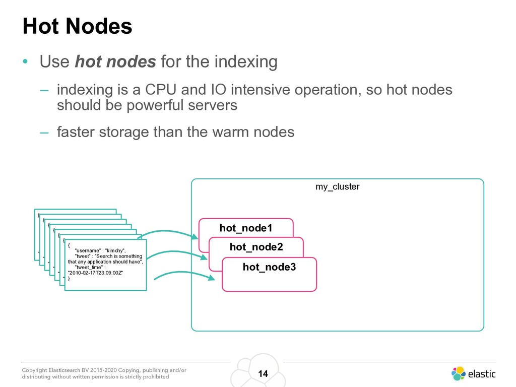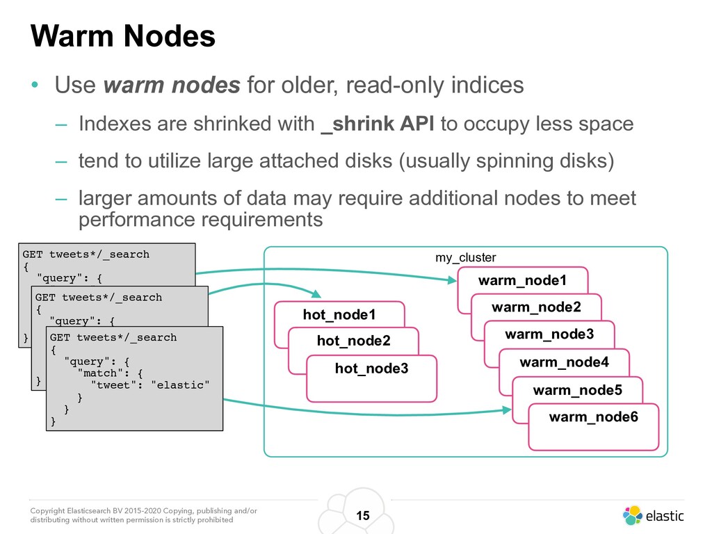 permission is strictly prohibited Hot Nodes • Use hot nodes for the indexing ‒ indexing is a CPU and IO intensive operation, so hot nodes should be powerful servers ‒ faster storage than the warm nodes 14 my_cluster { "volume": 46965, "high": 31.56, "stock_symbol": "ALL", "low": 30.68, "close": 30.91, "trade_date": "2010-01-15T07:00:00.000Z", { "volume": 46965, "high": 31.56, "stock_symbol": "ALL", "low": 30.68, "close": 30.91, "trade_date": "2010-01-15T07:00:00.000Z", { "volume": 46965, "high": 31.56, "stock_symbol": "ALL", "low": 30.68, "close": 30.91, "trade_date": "2010-01-15T07:00:00.000Z", { "volume": 46965, "high": 31.56, "stock_symbol": "ALL", "low": 30.68, "close": 30.91, "trade_date": "2010-01-15T07:00:00.000Z", { "volume": 46965, "high": 31.56, "stock_symbol": "ALL", "low": 30.68, "close": 30.91, "trade_date": "2010-01-15T07:00:00.000Z", { "volume": 46965, "high": 31.56, "stock_symbol": "ALL", "low": 30.68, "close": 30.91, "trade_date": "2010-01-15T07:00:00.000Z", { "username" : "kimchy", "tweet" : "Search is something that any application should have", "tweet_time" : "2010-02-17T23:09:00Z" } hot_node1 hot_node2 hot_node3
