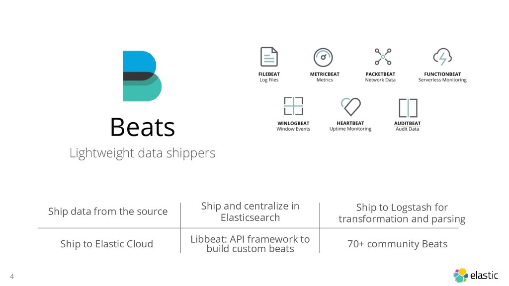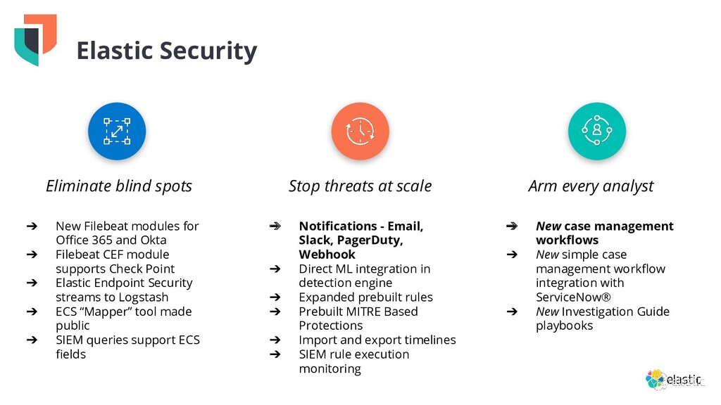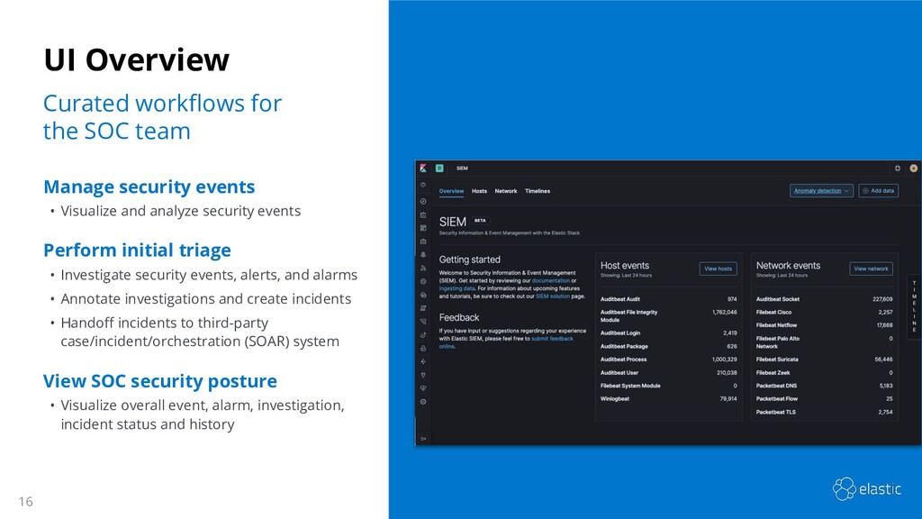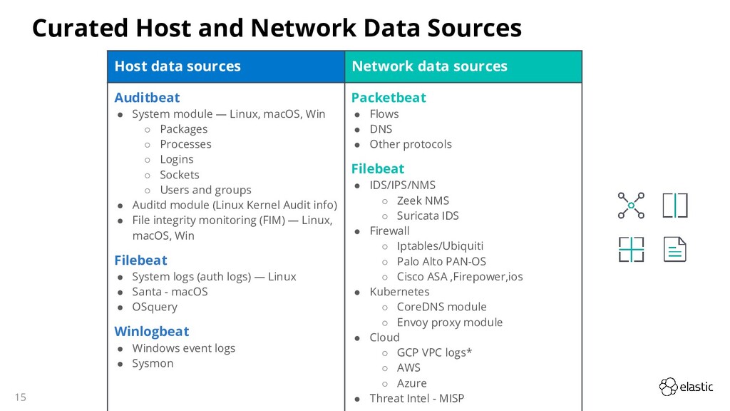 Network data sources Auditbeat • System module — Linux, macOS, Win ◦ Packages ◦ Processes ◦ Logins ◦ Sockets ◦ Users and groups • Auditd module (Linux Kernel Audit info) • File integrity monitoring (FIM) — Linux, macOS, Win Filebeat • System logs (auth logs) — Linux • Santa - macOS • OSquery Winlogbeat • Windows event logs • Sysmon Packetbeat • Flows • DNS • Other protocols Filebeat • IDS/IPS/NMS ◦ Zeek NMS ◦ Suricata IDS • Firewall ◦ Iptables/Ubiquiti ◦ Palo Alto PAN-OS ◦ Cisco ASA ,Firepower,ios • Kubernetes ◦ CoreDNS module ◦ Envoy proxy module • Cloud ◦ GCP VPC logs* ◦ AWS ◦ Azure • Threat Intel - MISP