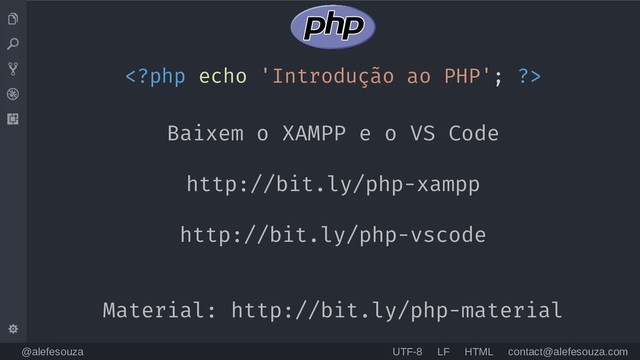 Baixem o XAMPP e o VS Code http://bit.ly/php-xampp http://bit.ly/php-vscode Material: http://bit.ly/php-material
