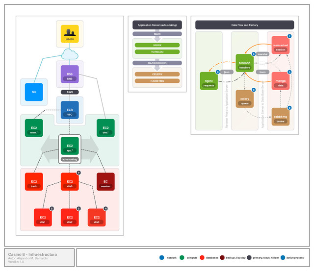 Reverse Proxy to Application Server Application Server to Data Base Server AWS users CELERY BACKGROUND Data Flow and Factory tornado memcached celery nginx rabbitmq session handlers requests queue broker 8 8 8 1 8 mongo data 5 databases backup 2 by day primary, slave, hidden active process RABBITMQ auto scaling compute network EC2 EC2 EC2 EC S3 ELB EC2 EC2 EC2 EC2 r0s3 S S H P r0s0 track session EC2 R53 VPC DNS dev.* app.* www.* r0s1 r0s2 json marshal bson MAIN Application Server (auto scaling) TORNADO NGINX
