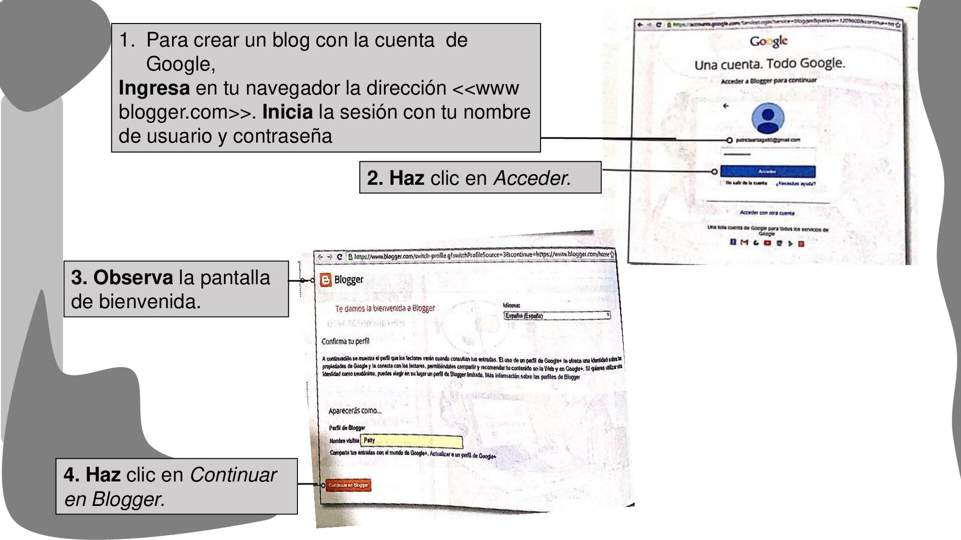 Ingresa en tu navegador la dirección <<www blogger.com>>. Inicia la sesión con tu nombre de usuario y contraseña 2. Haz clic en Acceder. 3. Observa la pantalla de bienvenida. 4. Haz clic en Continuar en Blogger.