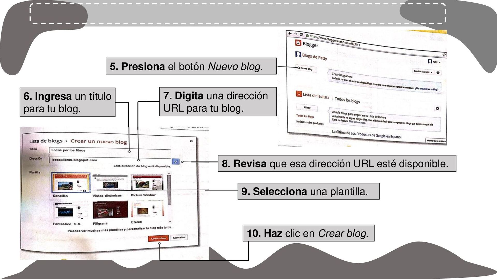 para tu blog. 7. Digita una dirección URL para tu blog. 8. Revisa que esa dirección URL esté disponible. 9. Selecciona una plantilla. 10. Haz clic en Crear blog.