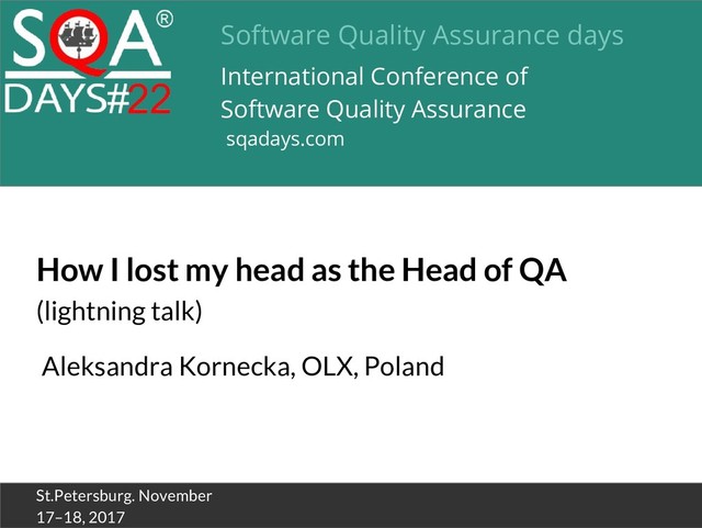 sqadays.com St.Petersburg. November 17–18, 2017 Aleksandra Kornecka, OLX, Poland How I lost my head as the Head of QA (lightning talk)