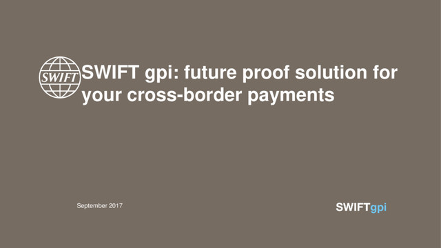 China Akbank Alfa-Bank ANZ BBVA Banco de Crédito del Perú Banco de Galicia Banco Inbursa Banque Centrale Populaire Bank for Foreign Trade of Vietnam Bank of America Merrill Lynch Bank of China Bank of Communications Bank of Jiangsu Bank of Montreal Bank of New York Mellon Bank of Ningbo Bank of Nova Scotia Bank of Tokyo-Mitsubishi Bank of Yinzhou Barclays Bayerische Landesbank Bidvest Bank BNP Paribas Cajamar Caja Rural Canadian Imperial Bank of Commerce Central Africa Building Society China Citic Bank China Construction Bank China Minsheng Banking Corporation Citibank Commerzbank Commonwealth Bank of Australia Crédit Mutuel-CIC Banques CTBC Bank Danske Bank DBS Bank Deutsche Bank Denizbank DNB Bank Ebury E.SUN Commercial Bank Erste Group Bank FirstRand Bank Guangfa Bank Landesbanken-Hessen-Thueringen Over 120 global transaction banks committed to gpi Countries 220+ SWIFT cross-border payments 75% HSBC ICBC Industrial Bank ING Bank Intesa Sanpaolo INTL FCStone JPMorgan Chase Bank KBC Bank KEB Hana Bank Lek Securities Corporation Lloyds Bank Mashreq Bank Mizuho Bank National Australia Bank National Commercial Bank Natixis Nedbank Nordea Bank Oversea Chinse Banking Corporation Ping An Bank Piraeus Bank Postal Savings Bank of China PKO Bank Polski Rabobank Raiffeisen Bank International Royal Bank of Canada Santander Sberbank Shanghai Pudong Development Bank Siam Commercial Bank Skandinaviska Enskilda Banken Société Générale Standard Bank of South Africa Standard Chartered Bank Sumitomo Mitsui Banking Corporation Tadhamon International Islamic bank TEB The Commercial Bank of Kuwait Toronto-Dominion Bank Turkiye Cumhuriyeti Ziraat Bankasi UBS Group UniCredit Wells Fargo Westpac Banking Corporation Yapi Ve Kredi Bankasi Zhejiang Rural Credit Cooperative Union 6 live
