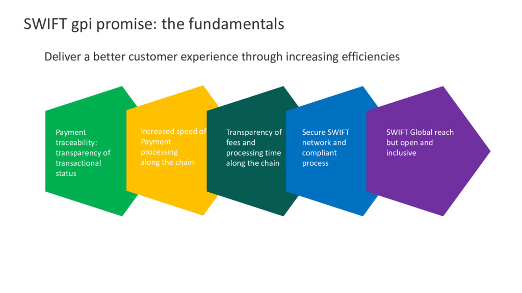status Increased speed of Payment processing along the chain Deliver a better customer experience through increasing efficiencies Transparency of fees and processing time along the chain Secure SWIFT network and compliant process SWIFT Global reach but open and inclusive