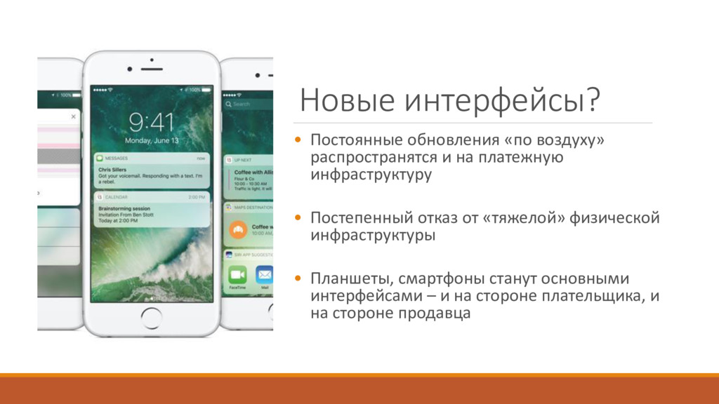 платежную инфраструктуру • Постепенный отказ от «тяжелой» физической инфраструктуры • Планшеты, смартфоны станут основными интерфейсами – и на стороне плательщика, и на стороне продавца