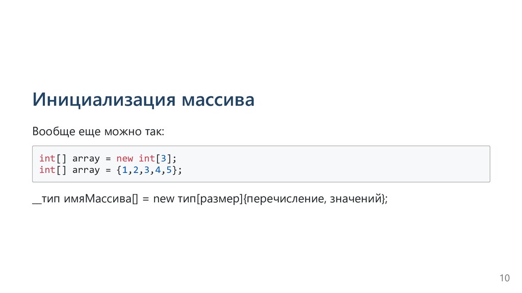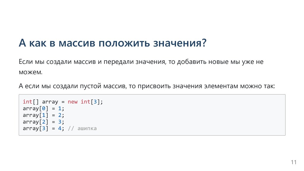 и передали значения, то добавить новые мы уже не можем. А если мы создали пустой массив, то присвоить значения элементам можно так: int[] array = new int[3]; array[0] = 1; array[1] = 2; array[2] = 3; array[3] = 4; // ашипка 11