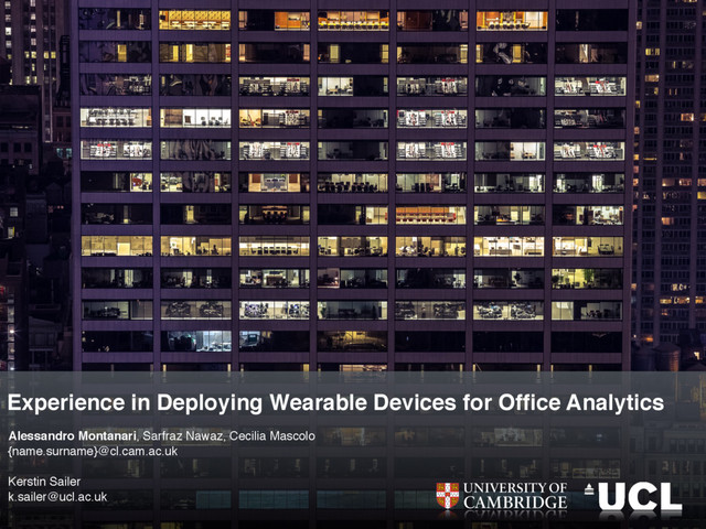 This talk reports our experience with a relatively large deployment of wearable devices in an architecture company in London for office analytics purposes.