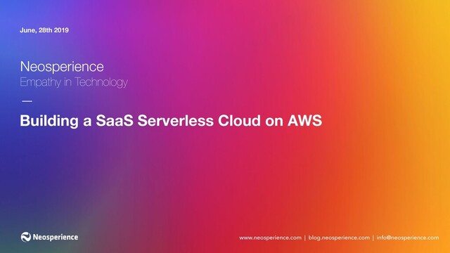 with a number of benefits Neosperience is a 100% Serverless cloud solution Business Domain Support ✓17 different business domains ✓5-10 microservices each domain ✓a dozen of support services (monitoring, maintenance, OAuth2, Organization, multi-tenancy, etc.) Serverless ✓100% Serverless except for ML model training Lambda Functions ✓200+ functions AWS Resources ✓400+ AWS resources ✓managed through a 15+ CloudFormation stacks Time to market ✓improved from months to weeks ✓business features released every sprint ✓technical features released multiple times a week Costs ✓reduced by an order of magnitude Team ✓developers provision cloud resources ✓innovation in encouraged, failure impact is bounded ✓shifted from running after business requirements to waiting for business requirements Happiness Dev Team has full control on delivery Business Team has feature delivery