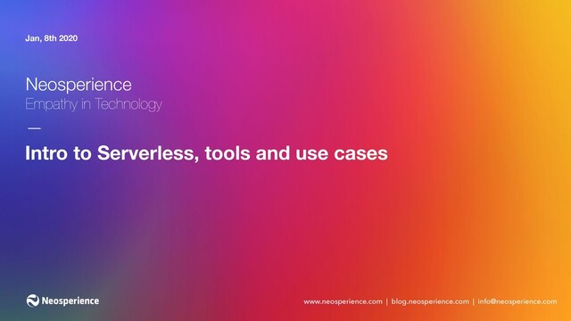 with a number of benefits Neosperience is a 100% Serverless cloud solution Business Domain Support ✓17 different business domains ✓5-10 microservices each domain ✓a dozen of support services (monitoring, maintenance, OAuth2, Organization, multi-tenancy, etc.) Serverless ✓100% Serverless except for ML model training Lambda Functions ✓200+ functions AWS Resources ✓400+ AWS resources ✓managed through a 15+ CloudFormation stacks Time to market ✓improved from months to weeks ✓business features released every sprint ✓technical features released multiple times a week Costs ✓reduced by an order of magnitude Team ✓developers provision cloud resources ✓innovation in encouraged, failure impact is bounded ✓shifted from running after business requirements to waiting for business requirements Happiness Dev Team has full control on delivery Business Team has feature delivery