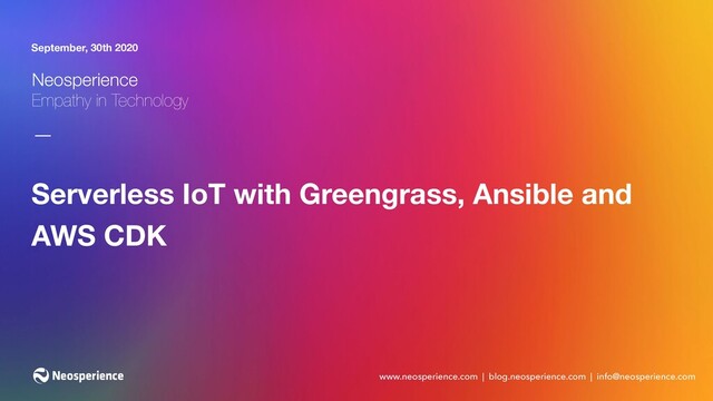 3. Core and Core Version creation 4. Logger, resources and connector creation 5. Greengrass group definition and resource linking to versions 0. Device setup A simple shell rule (for a Linux environment) runs CDK to create: - a Greengrass core and its version - at least one Greengrass role for each resource to execute code and access cloud - log groups and log definitions - eventual group resources - group connectors to industrial services Using CloudFormation instead of AWS IoT APIs provides rollback and resource deletion capabilities, just deleting the corresponding stack AWS CDK allows to release this stack as a component to be integrated and extended for customization CDK is run from the device / Ansible to provision cloud resources