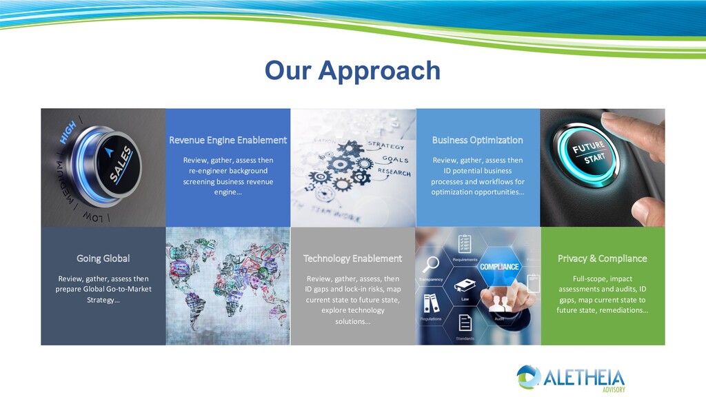 screening business revenue engine… Business Optimization Review, gather, assess then ID potential business processes and workflows for optimization opportunities… Technology Enablement Review, gather, assess, then ID gaps and lock-in risks, map current state to future state, explore technology solutions… Privacy & Compliance Full-scope, impact assessments and audits, ID gaps, map current state to future state, remediations… Going Global Review, gather, assess then prepare Global Go-to-Market Strategy… Our Approach