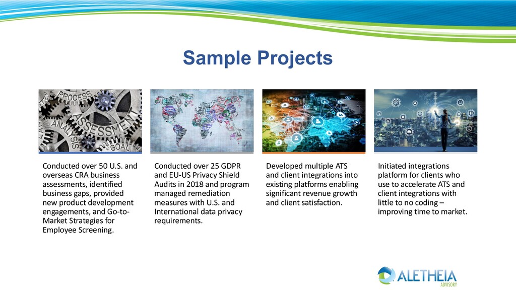 business gaps, provided new product development engagements, and Go-to- Market Strategies for Employee Screening. Conducted over 25 GDPR and EU-US Privacy Shield Audits in 2018 and program managed remediation measures with U.S. and International data privacy requirements. Developed multiple ATS and client integrations into existing platforms enabling significant revenue growth and client satisfaction. Initiated integrations platform for clients who use to accelerate ATS and client integrations with little to no coding – improving time to market. Sample Projects