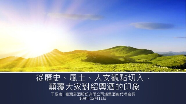 從歷史、風土、人文觀點切入, 顛覆大家對紹興酒的印象 丁丞康 | 臺灣菸酒股份有限公司埔里酒廠代理廠長 109年12月11日