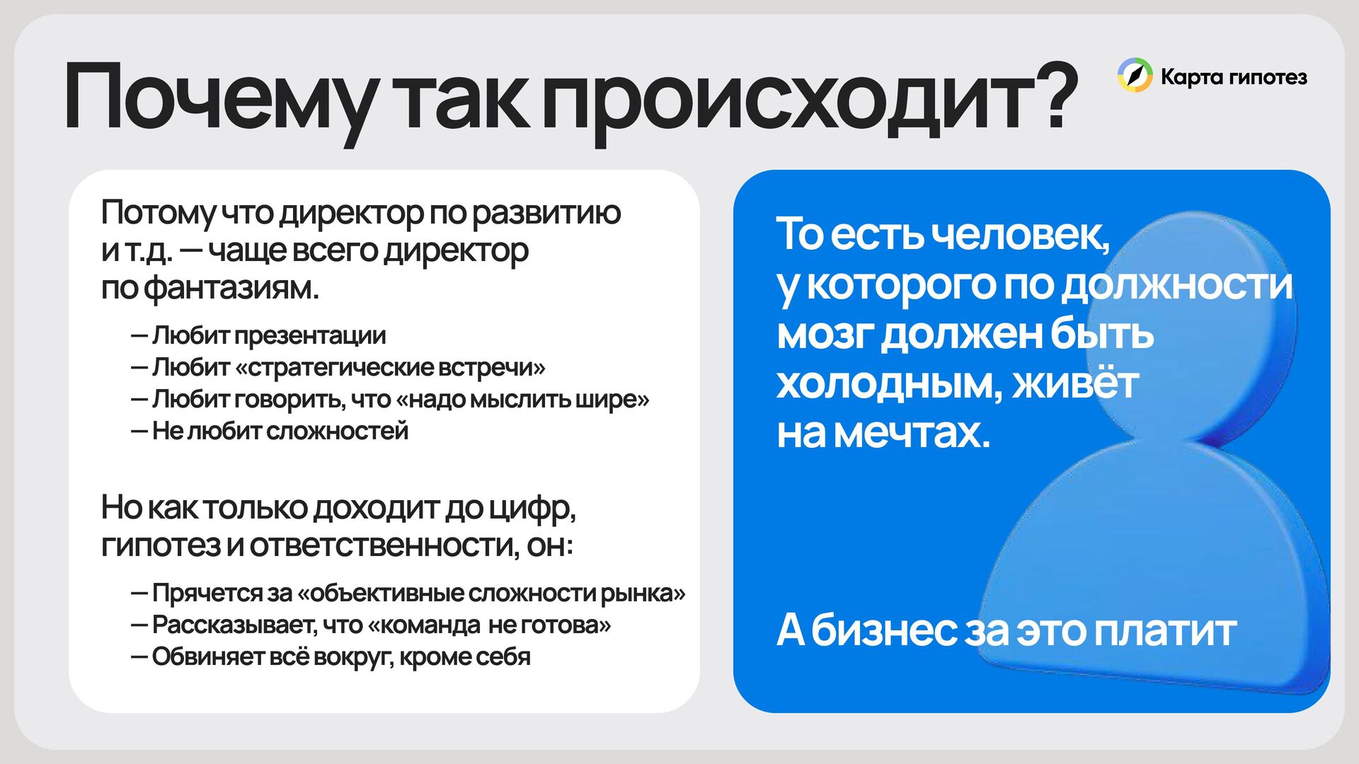 На выступлении вы поймёте, что реально закрывает реальные управленческие провалы: отсутствие единой логики решений, подмену стратегии дорожными картами и хроническую несобранность управленца, из-за которой компания теряет деньги и людей.
