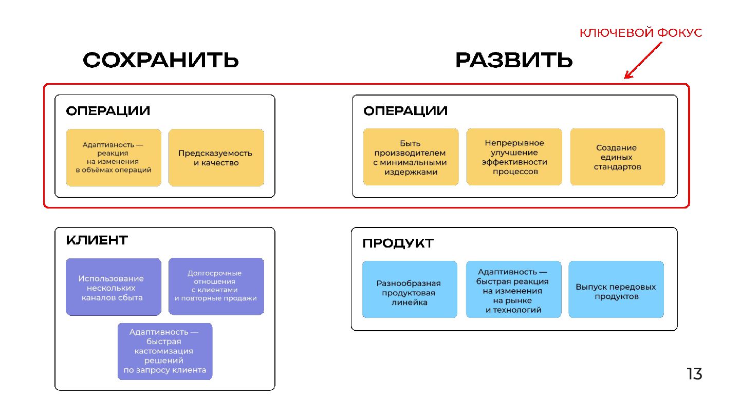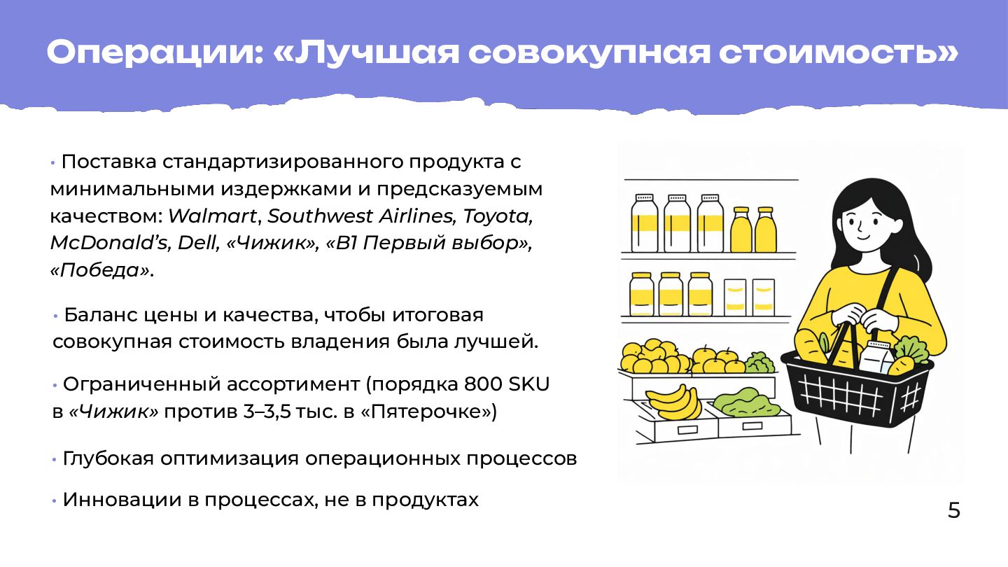 •Операции — выигрываешь ценой и логистикой (Валмарт, «Чижик», «Победа»). Ты — король эффективности.