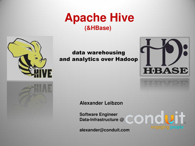 box solutions • Most of Analysts/BI are familiar with SQL • Automatically generates MR jobs • Easy porting of SQL-based code • Thrift/ODBC/JDBC • Lets YOU focus on data querying • Open Source and Apache TLP(Apache2 license)!