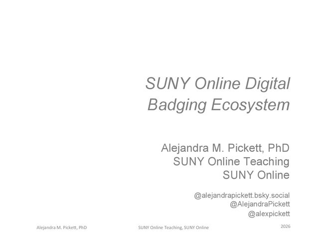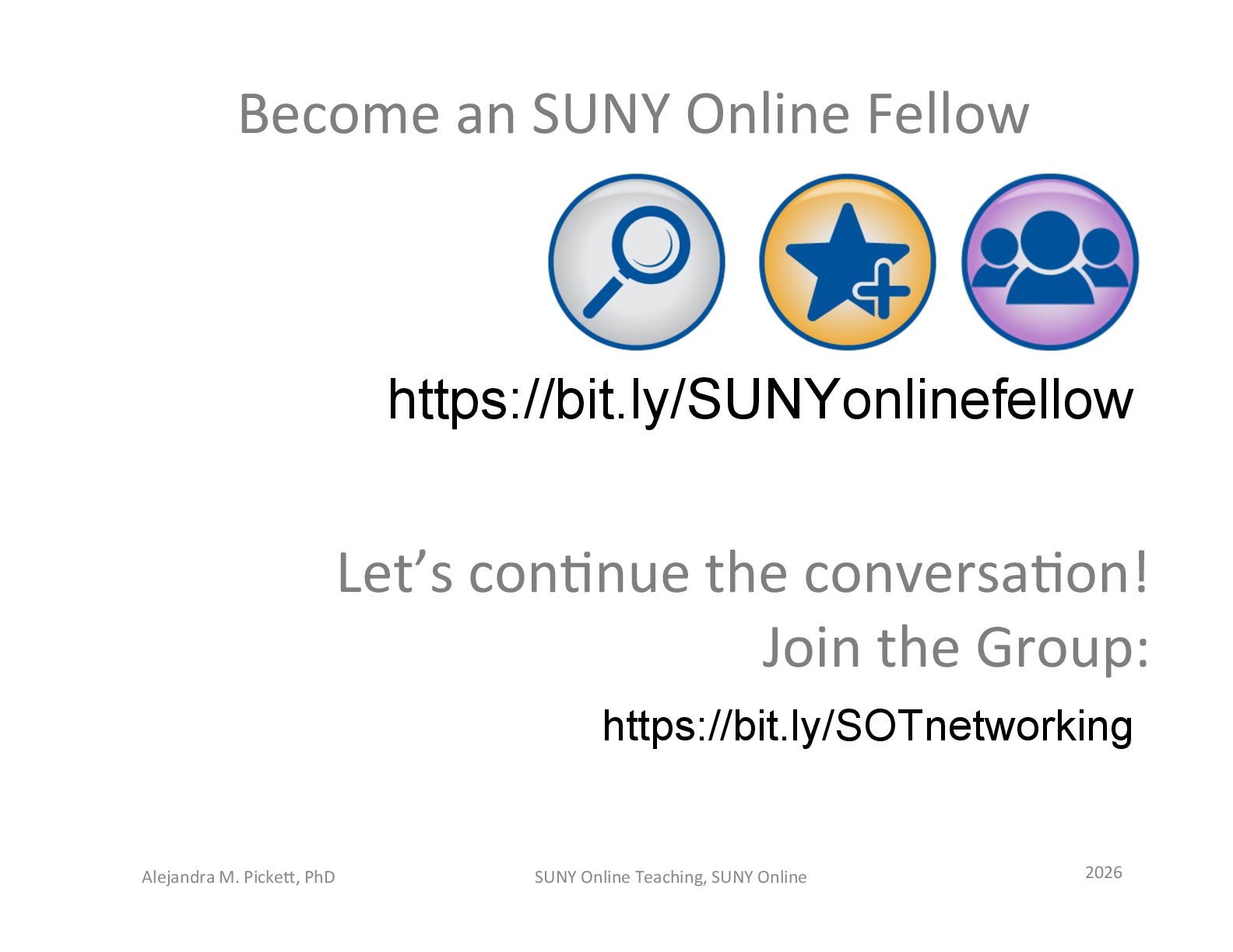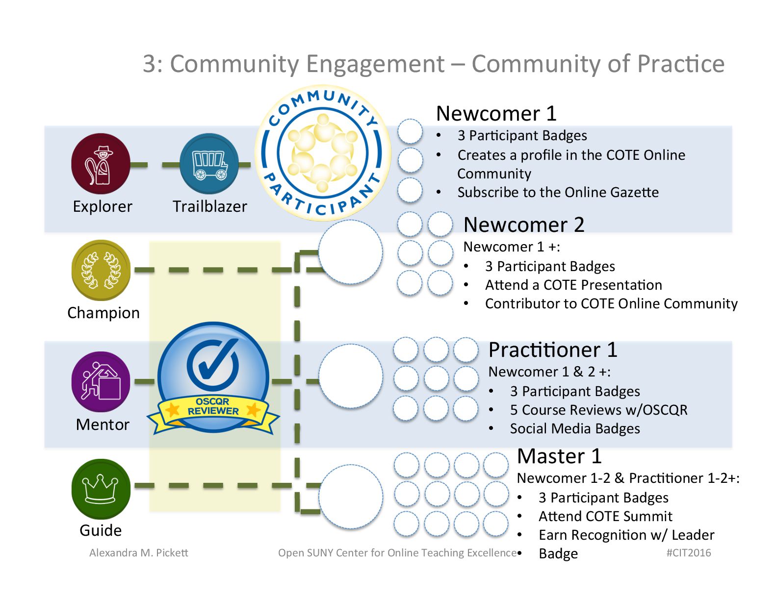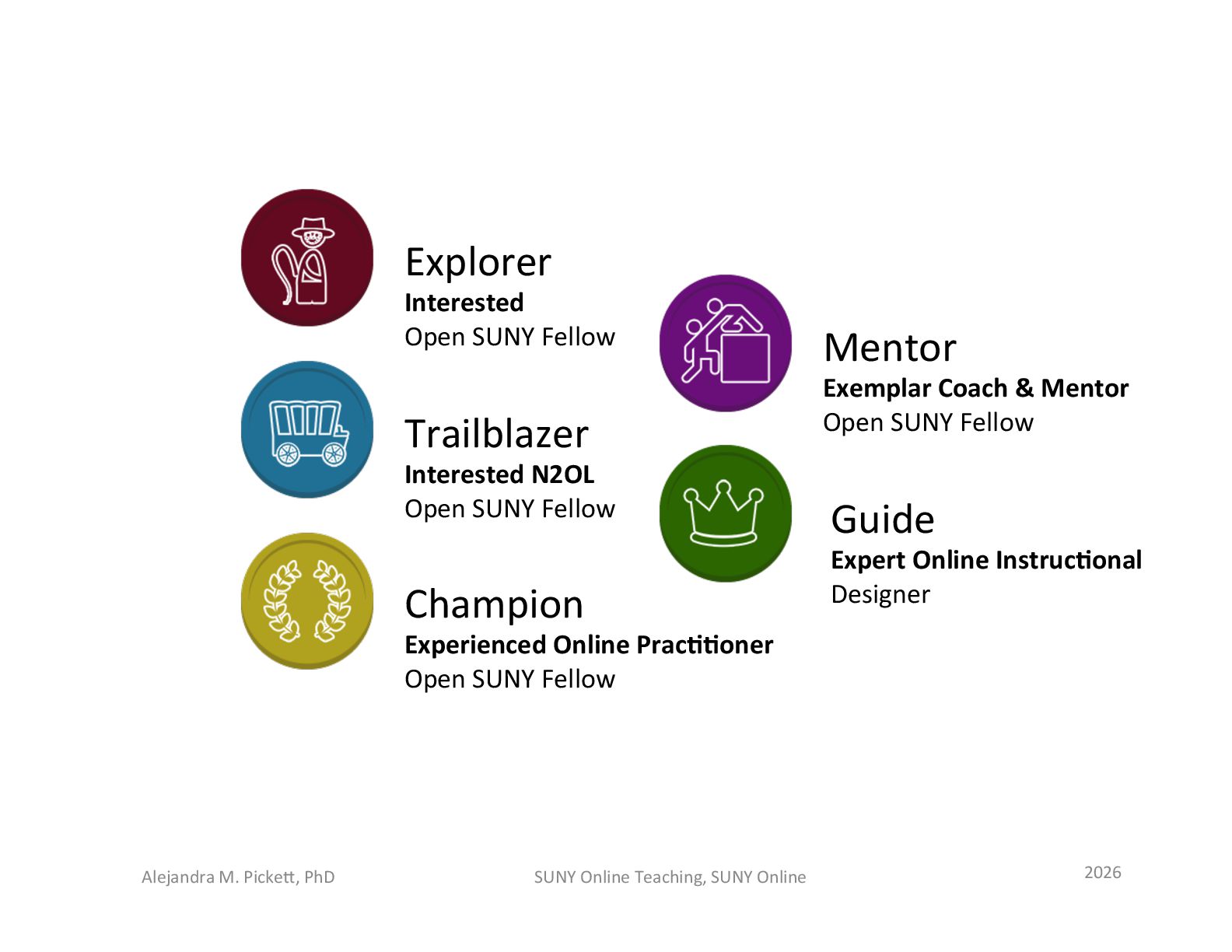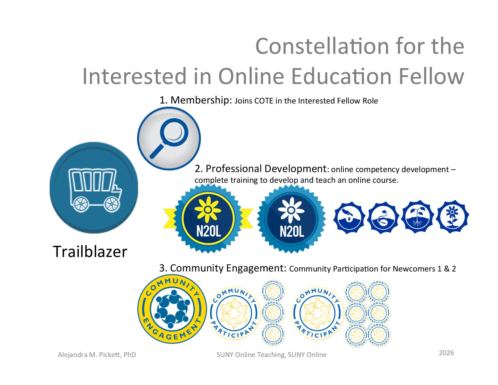 Trailblazer 2. Professional Development: online competency development – complete training to develop and teach an online course. 1. Membership: Joins COTE in the Interested Fellow Role 3. Community Engagement: Community ParNcipaNon for Newcomers 1 & 2 Alejandra M. Picke0, PhD SUNY Online Teaching, SUNY Online 2026